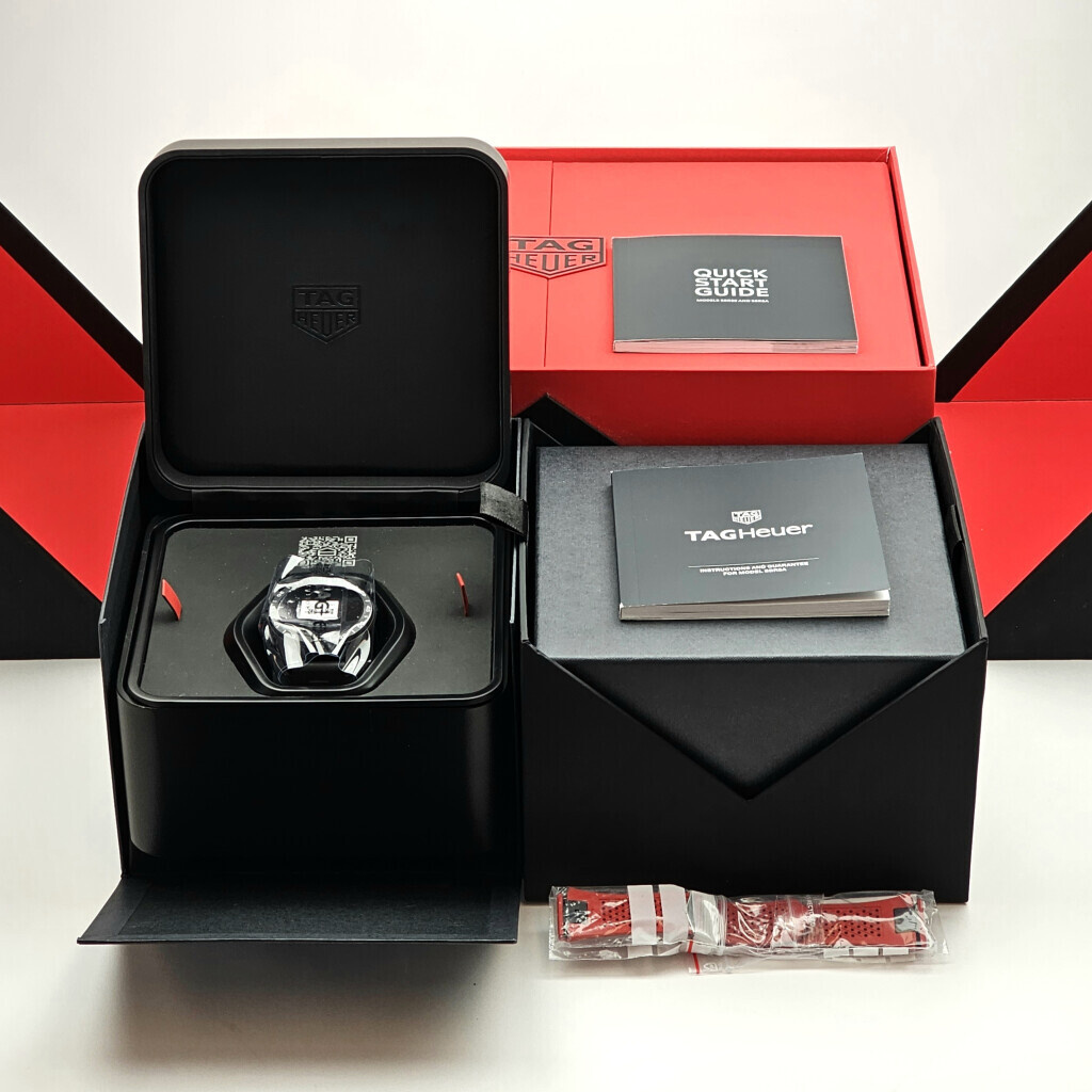 In very good condition TAG Heuer Connected Calibre E4 in ceramic with OLED screen and Qualcomm processor. Black rubber TAG Heuer strap + red TAG Heuer strap included. Complete with box and papers.