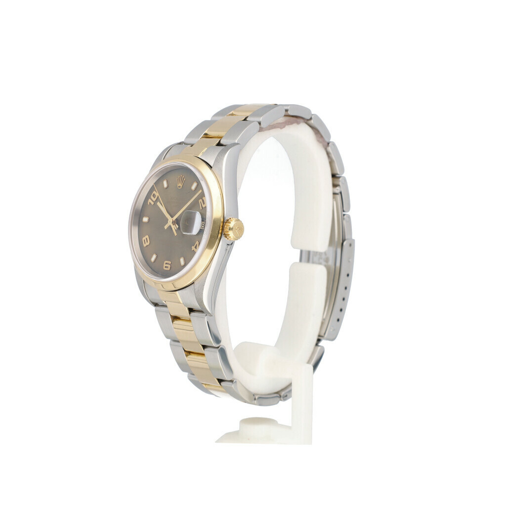 In very good condition Rolex Date 34 in steel and yellow gold with silver araic dial from 2003 complete with box and papers. Rolex serviced 3-2025 and not worn since. Rolex service certificate included.