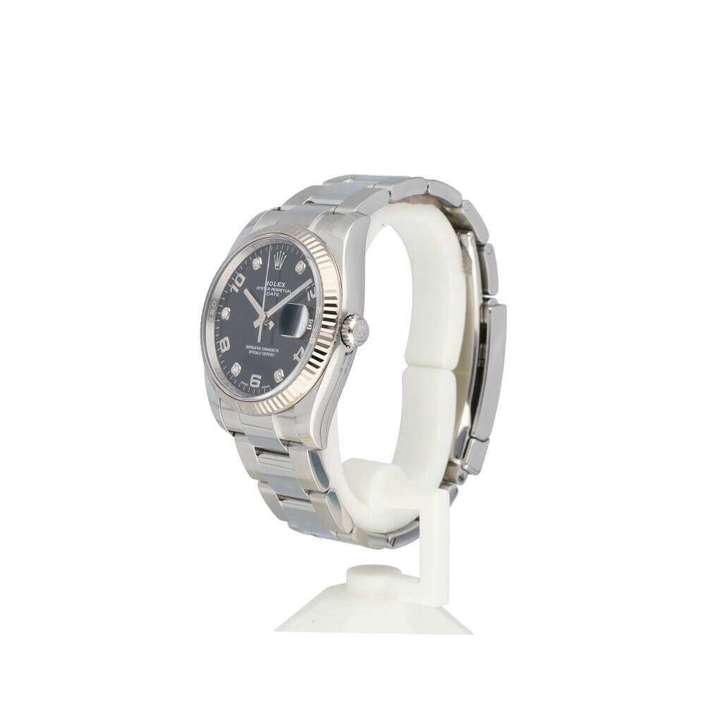 In very good condition Rolex Date in steel and white gold with black diamond dial and Oyster bracelet no box and/or papers. Random serial number so from after 2011.