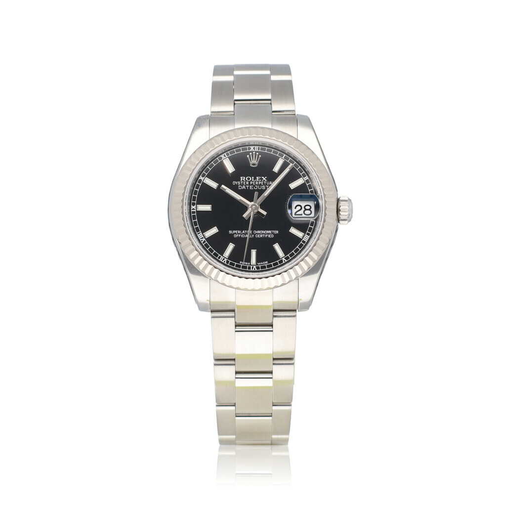 In perfect condition Rolex Datejust 31 in steel and white gold with black index dial and steel Oyster bracelet from 2019 complete with box and papers. Rolex serviced 7-2025 and not worn since. Rolex service certificate included.