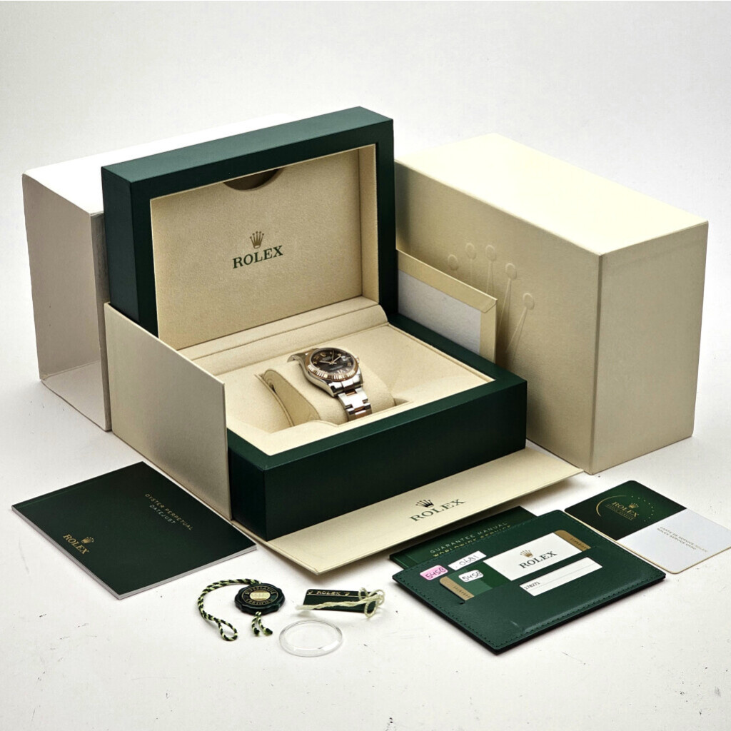 In very condition Rolex Datejust 31 in steel and rose gold with brown roman IV dial and steel and rose gold Oyster bracelet from 2016 complete with box and papers. Rolex serviced 6-2025 and not worn since. Rolex serivice certificate included.