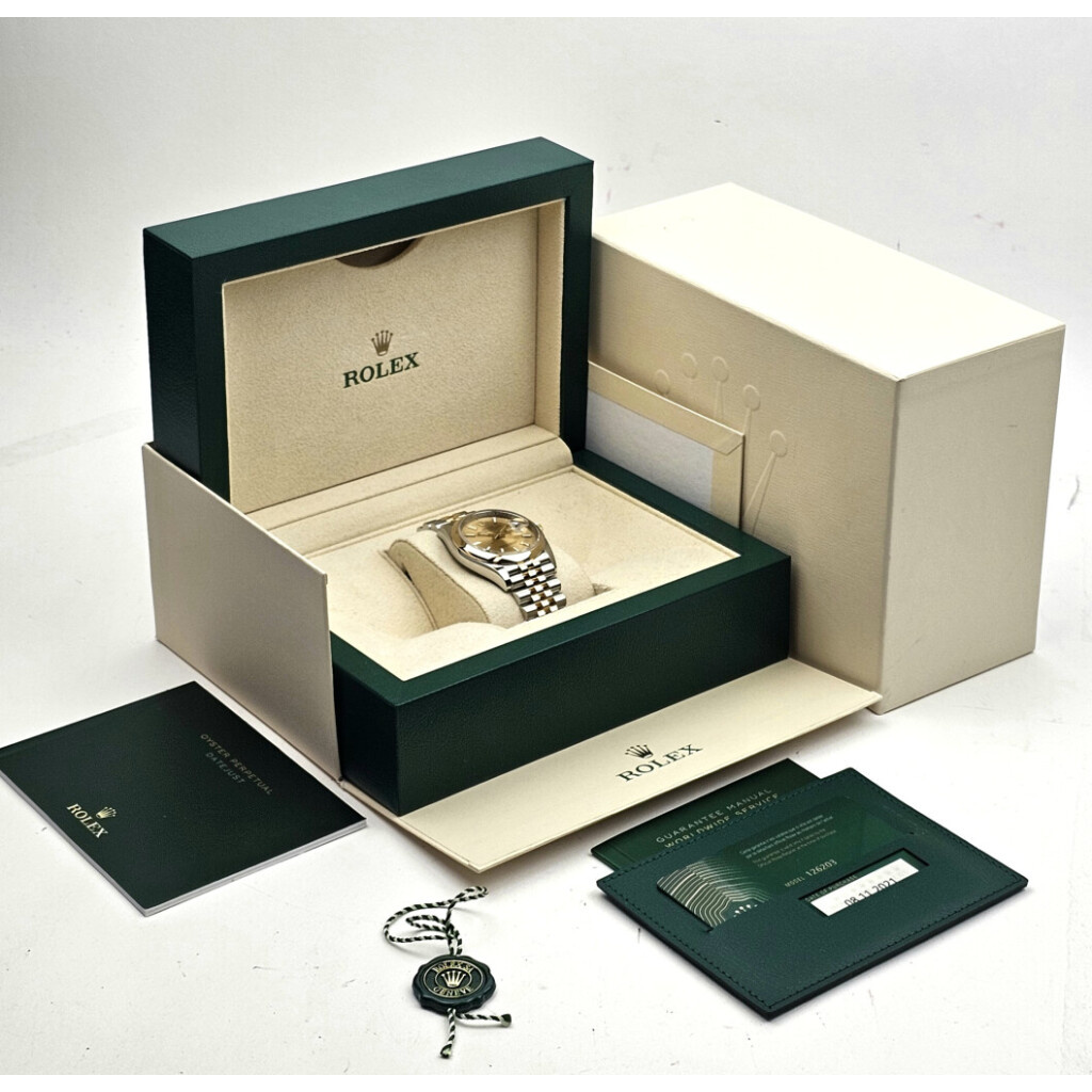 In very good condition Rolex Datejust 36 in steel and yellow gold with Jubilee bracelet and champagne dial from 2021 complete with box and papers.