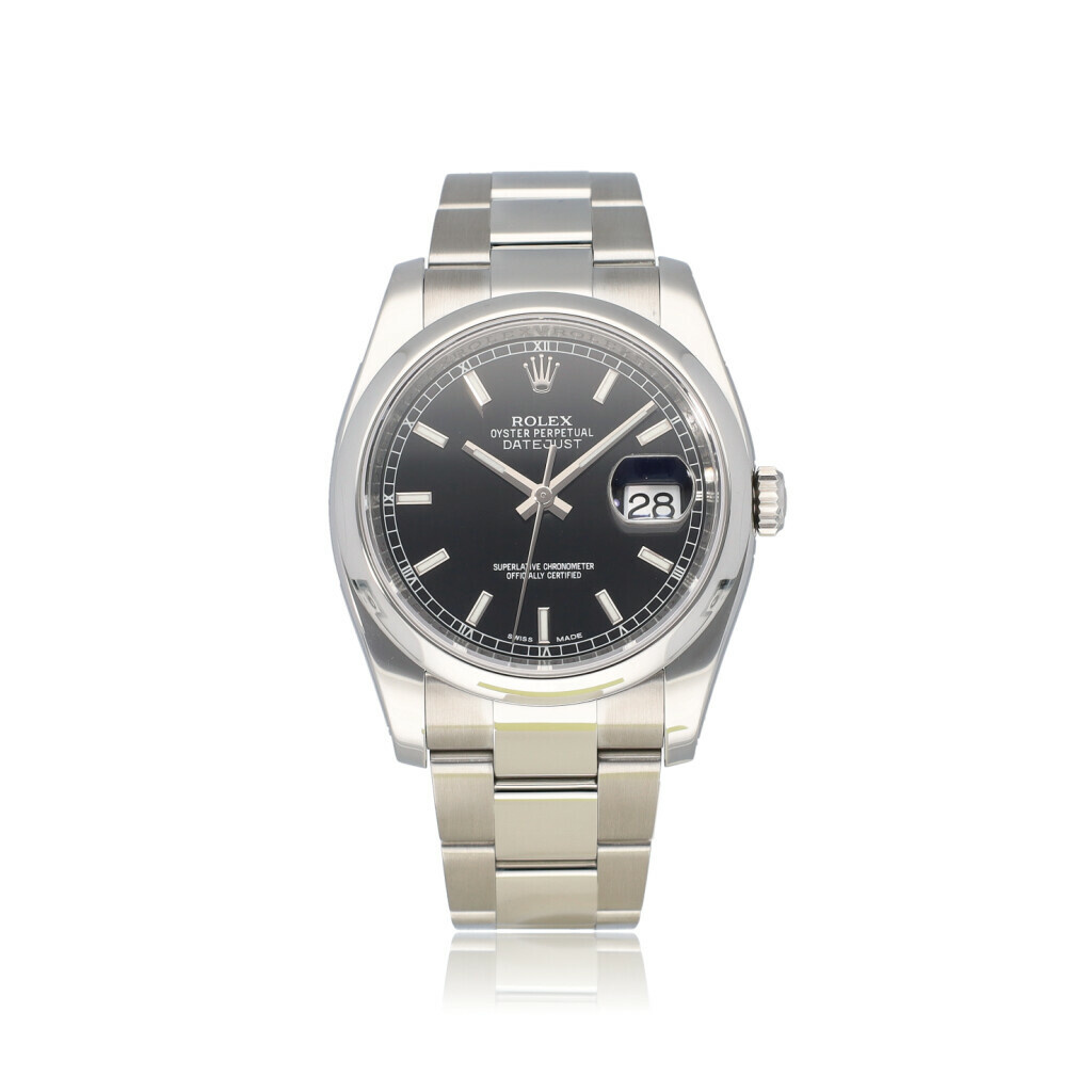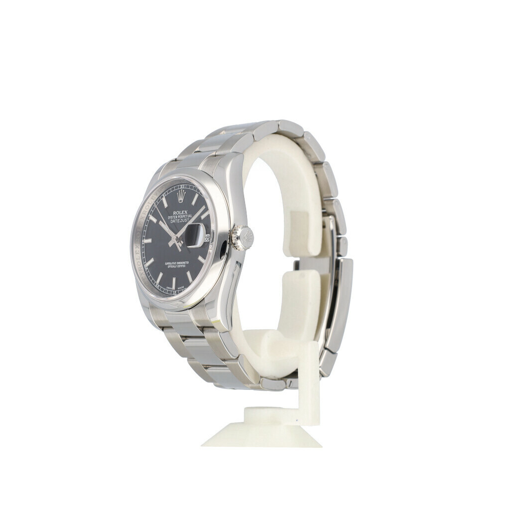 In very good condition Rolex Datejust 36 in steel with steel domes bezel, black dial, roulette date and steel Oyster bracelet from 2012 complete with papers, no box.