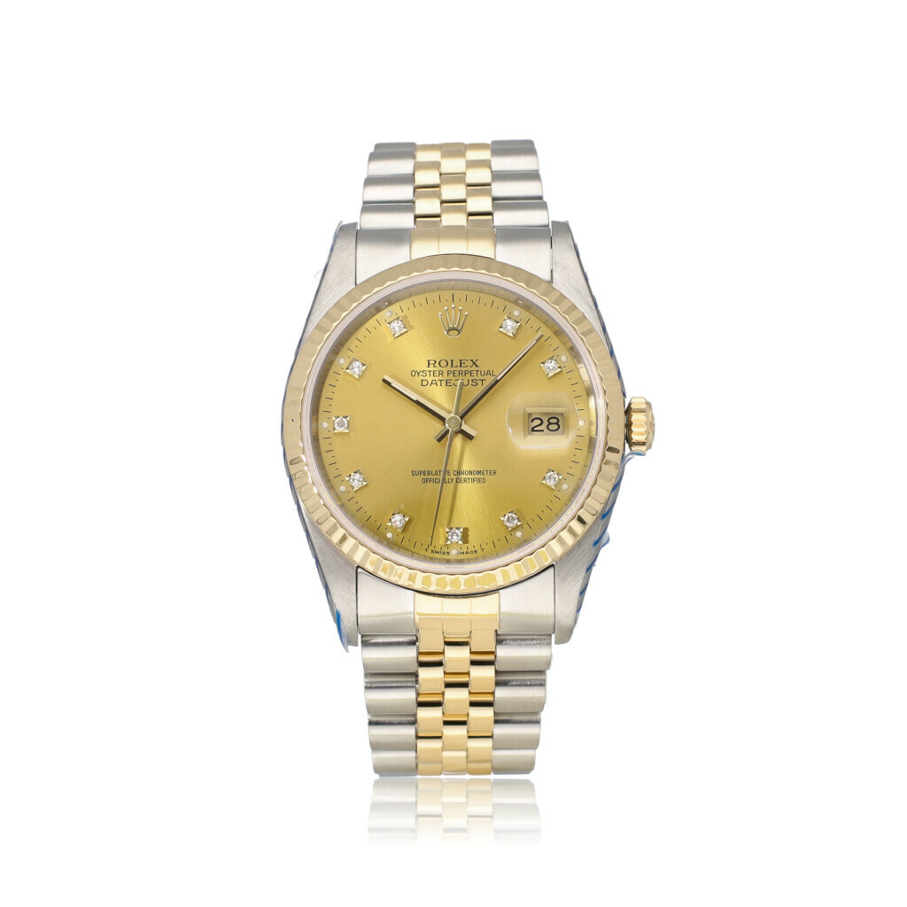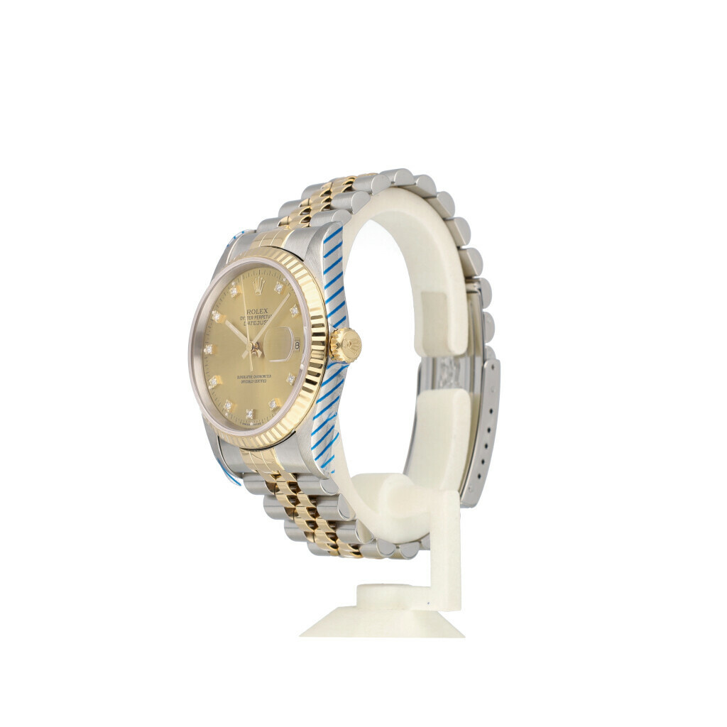 In very good condition, Rolex Datejust 36 in steel and yellow gold with champagne diamond dial, fluted yellow gold bezel and steel and yellow gold Jubilee bracelet from 1995 complete with papers, no box. Rolex serviced 10-2025 and not worn since. Rolex service certificate included.