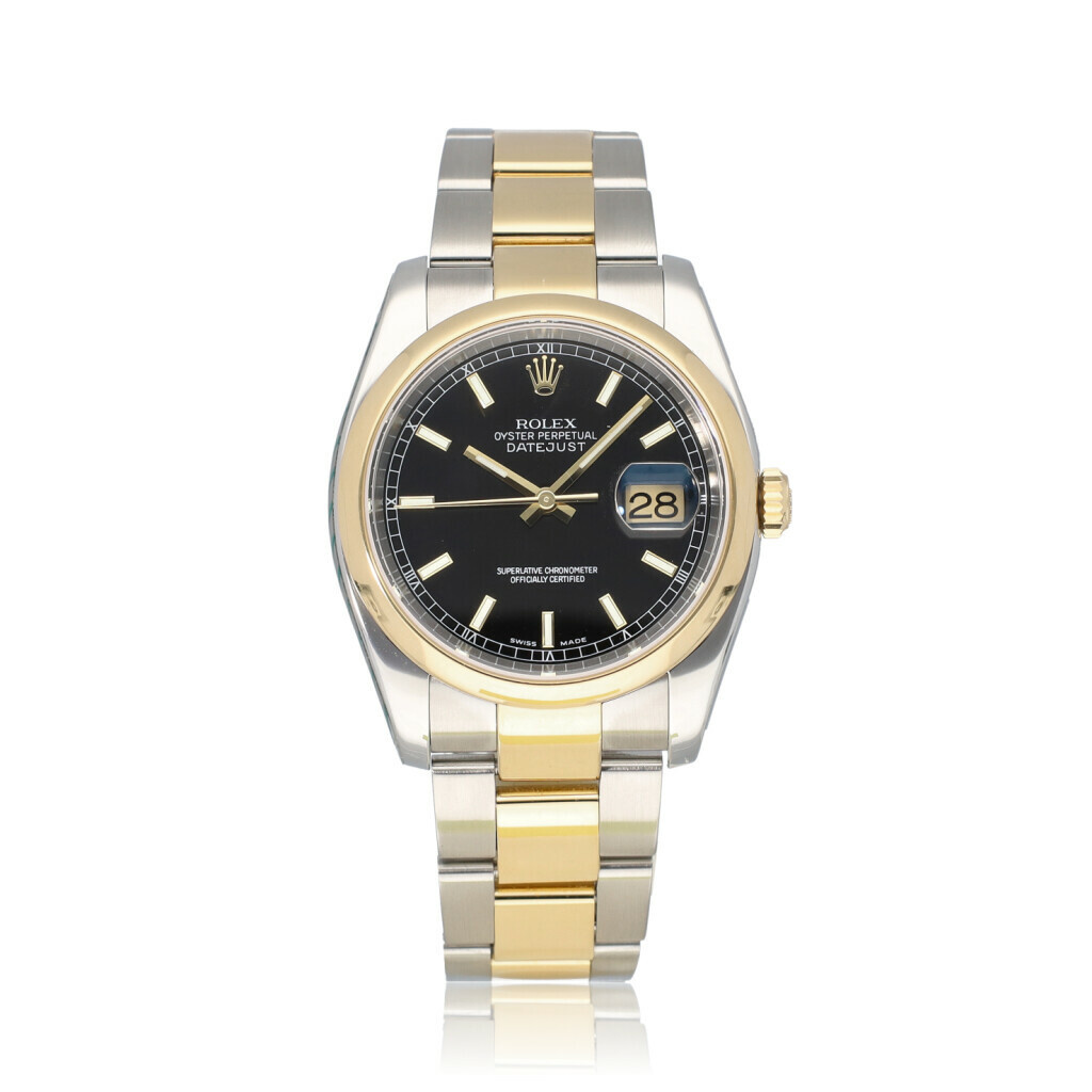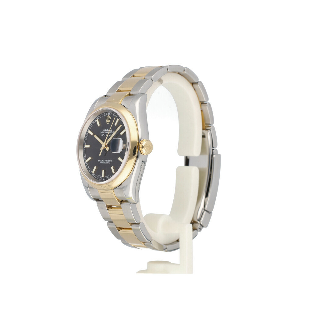 In very good condition Rolex Datejust 36 in steel and yellow gold with black dial and steel and yellow gold Oyster bracelet from 2005 complete with box and papers.