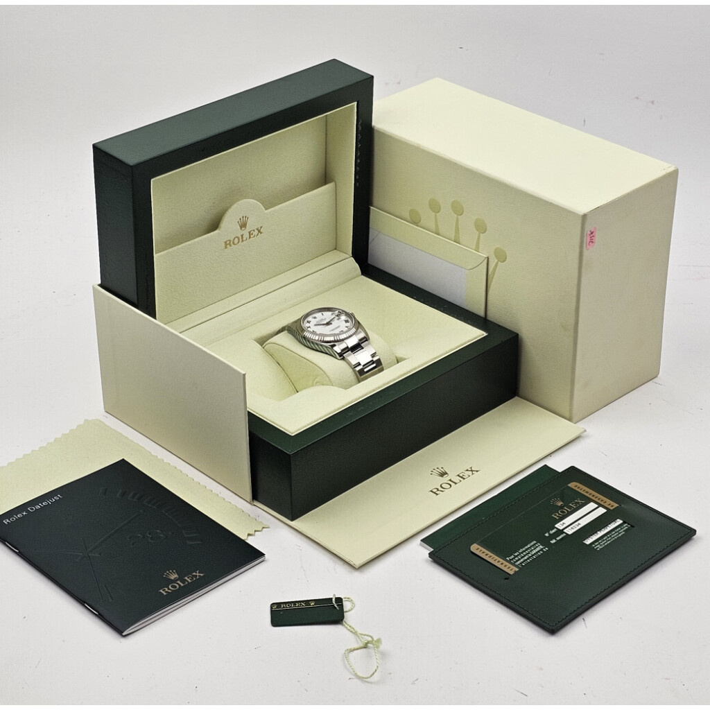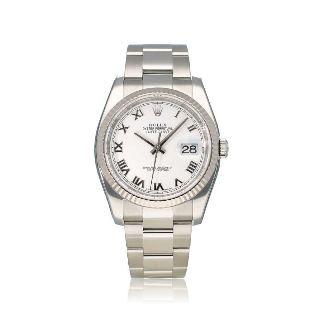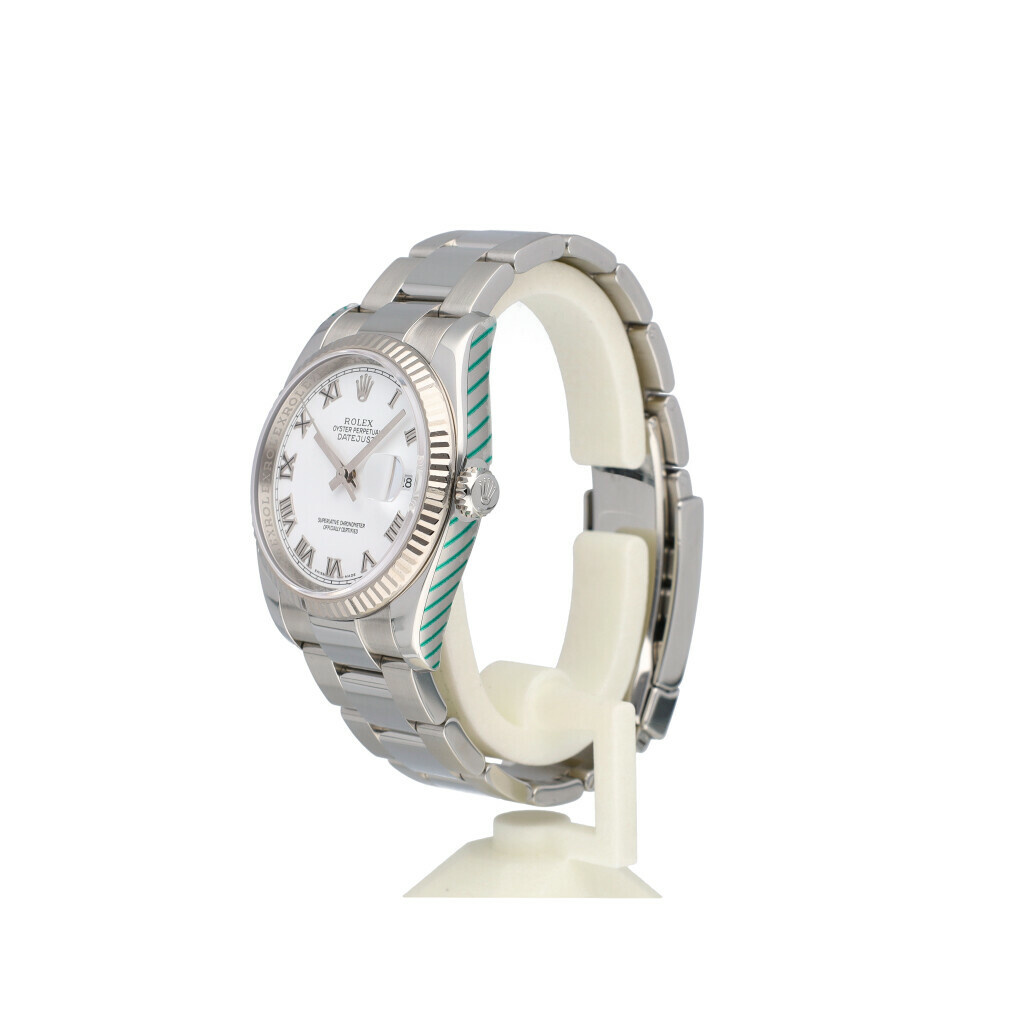 In very good condition Rolex Datejust 36 in steel with white roman dial and Osyeter bracelet from 2010 complete with box and papers.