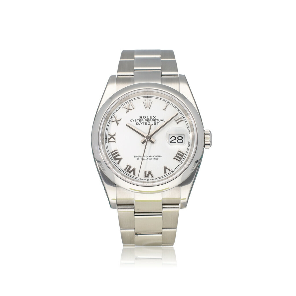 In very good condition Rolex Datejust 36mm with white roman dial, steel domed bezel and steel Oyster bracelet from 2019 complete with papers, no box. Rolex serviced 9-2025 and not worn since. Rolex service certificate included.