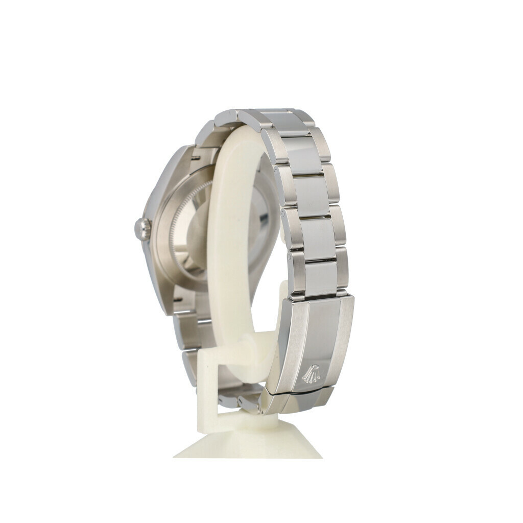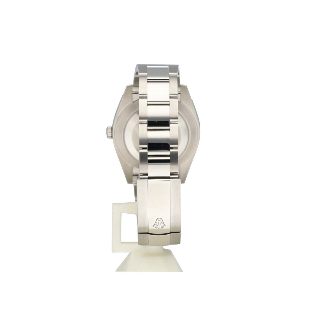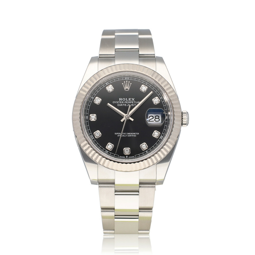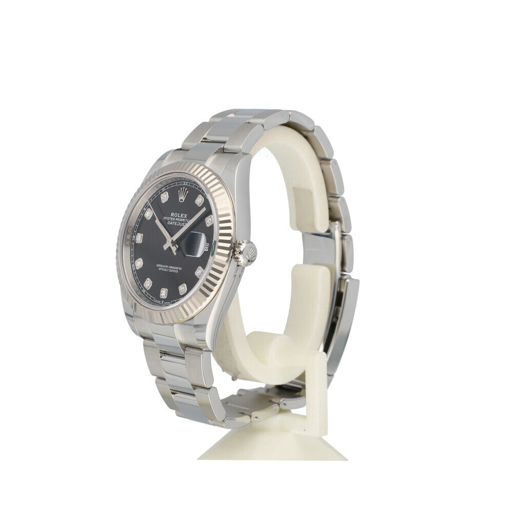 In very good condition Rolex Datejust 41 in steel and white gold with factory black diamond dial, white gold fluted bezel and steel Oyster bracelet from 2023 complete with box and papers.