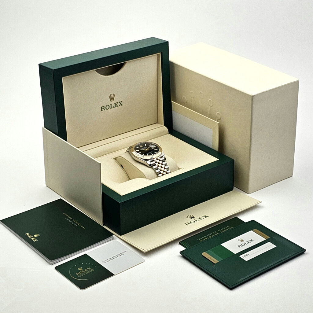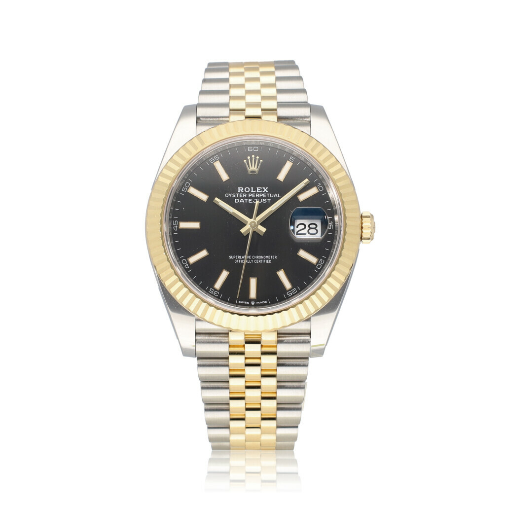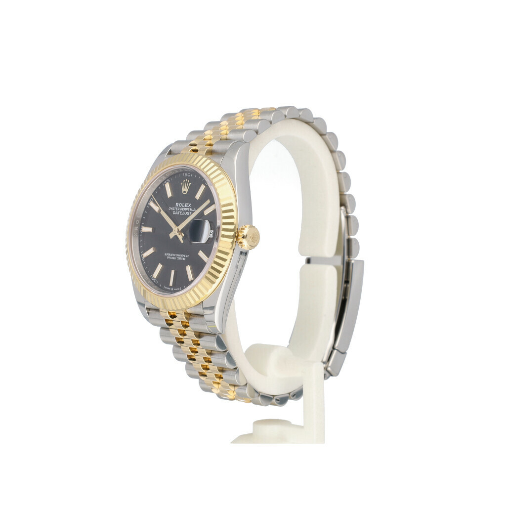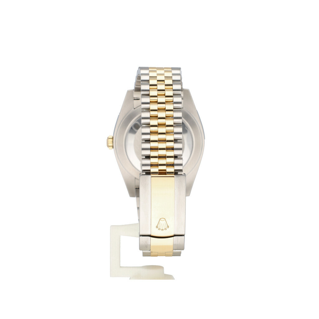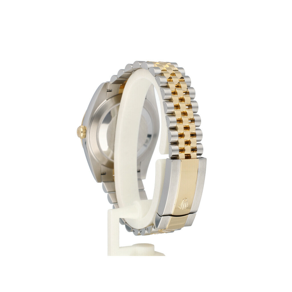 In very good condition Rolex Datejust 41 in steel and yellow gold with black dial and steel and yellow gold Jubilee bracelet from 2019 complete with box and papers. Rolex serviced 7-2025 and not worn since. Rolex service certificate included.
