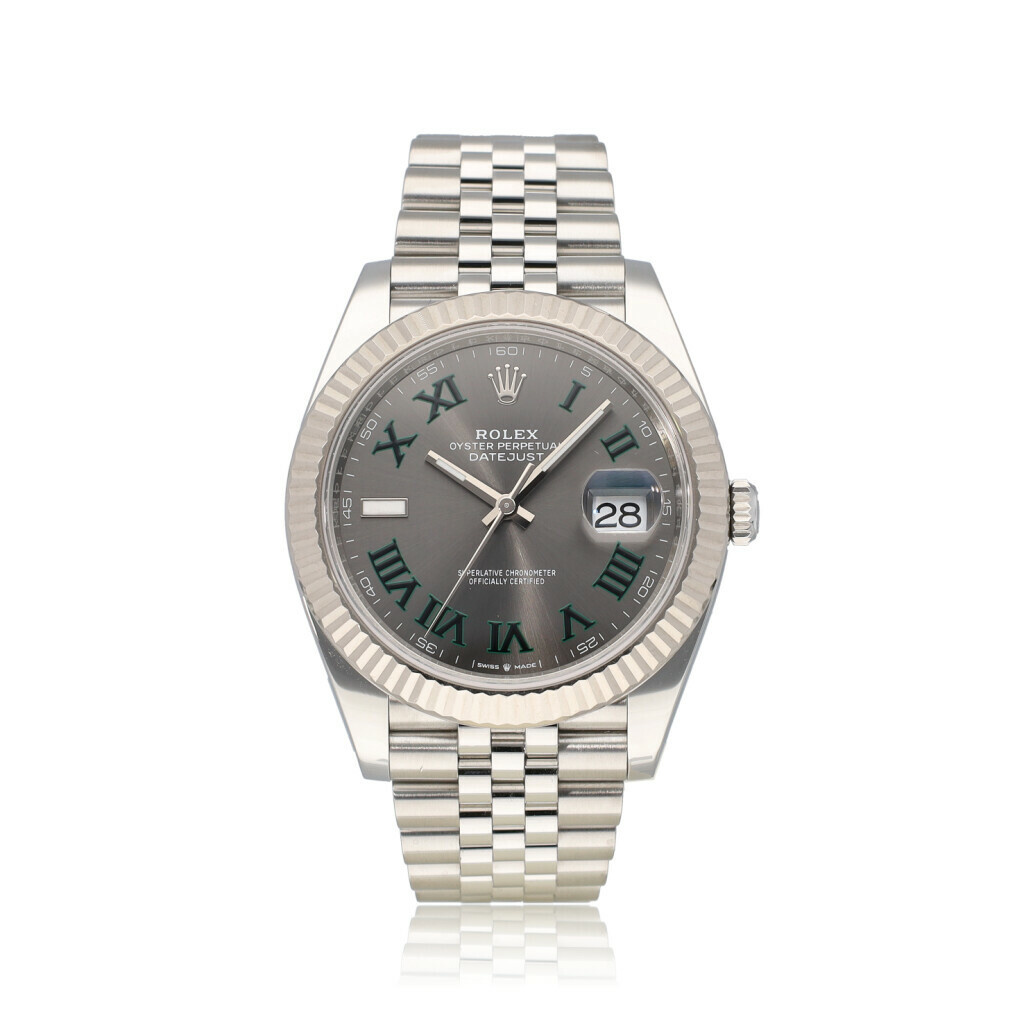 In very good condition Rolex Datejust 41 in steel and whitegold with so called 'Wimbledon' dial and Jubilee bracelet from 2021 complete with box and papers.