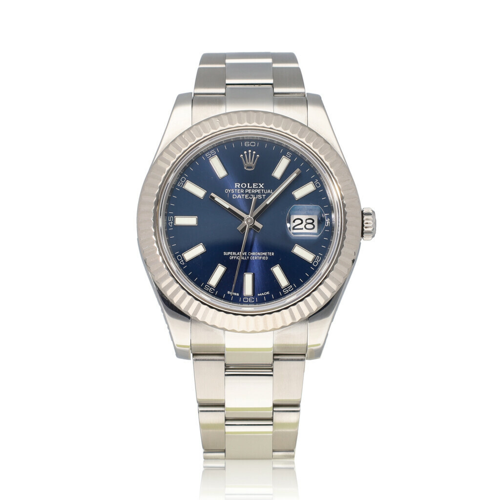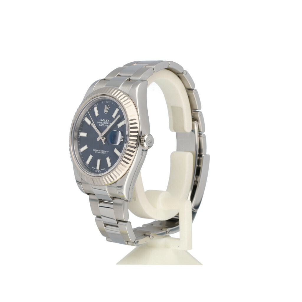 In very good condition Rolex Datejust 41 in steel and white gold with blue index dial, white gold fluted bezel and steel Oyster bracelet from 2016 complete with box and papers.