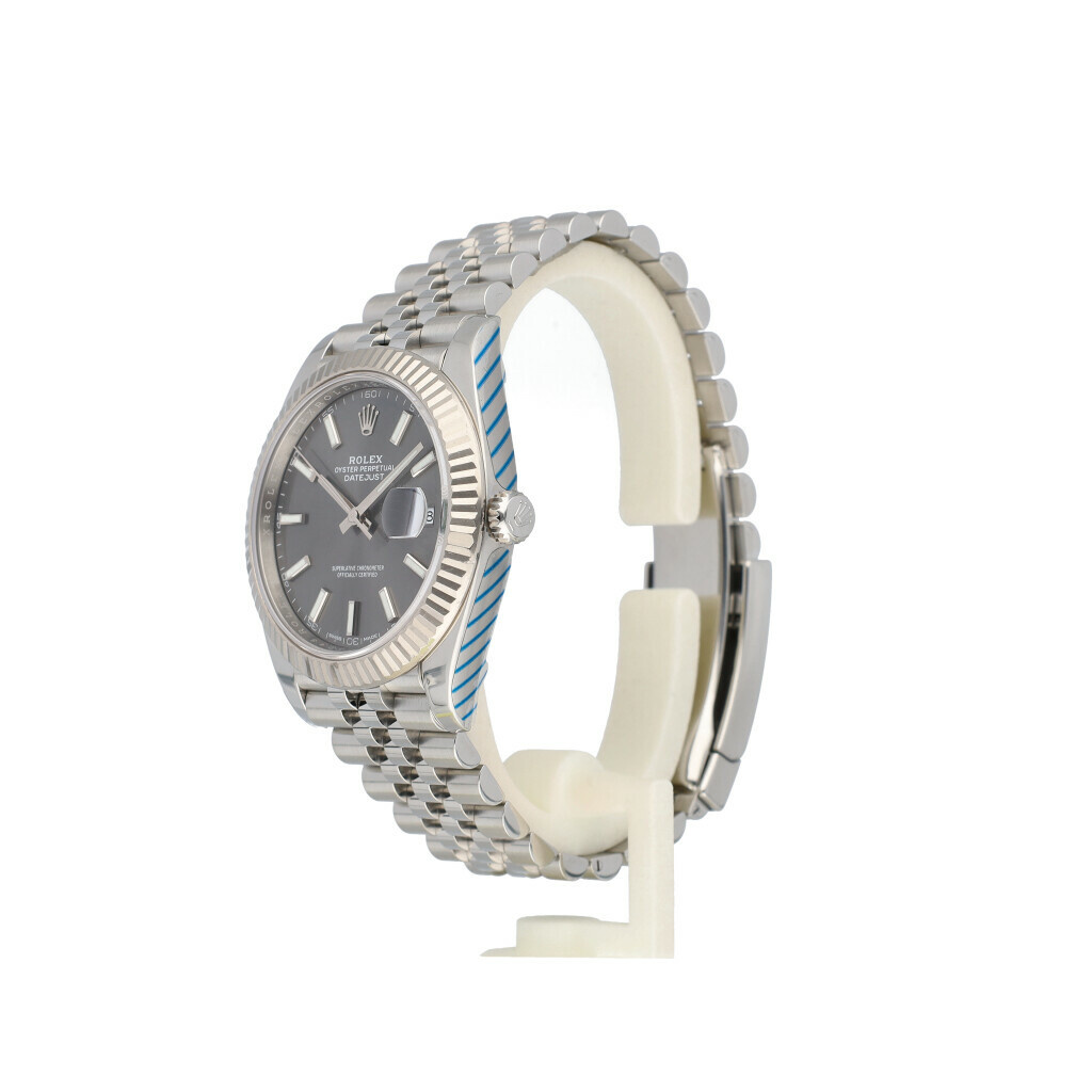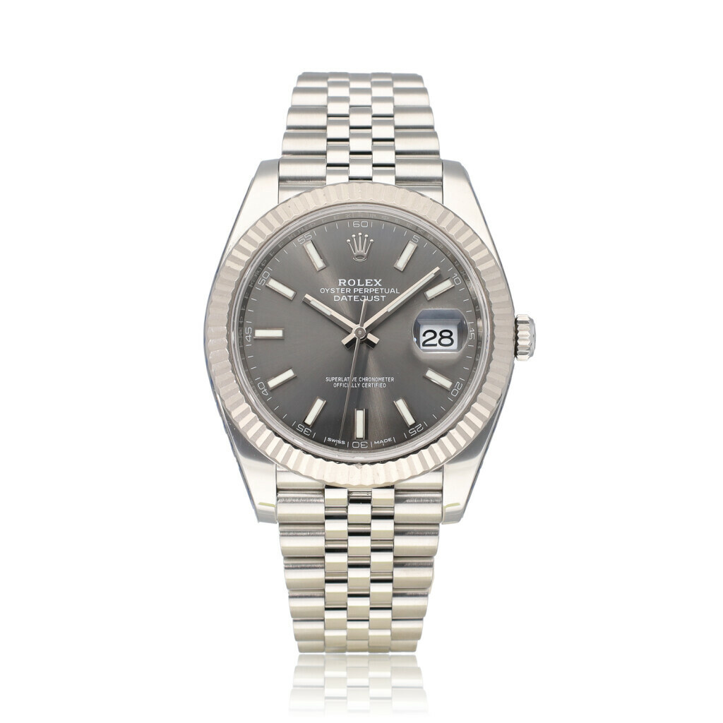 In very good condtion Rolex Datejust 41 in steel with rhodium / slate / grey dial and Jubilee bracelet complete with box, no papers. Rolex serviced 2-2026 and not worn since. Rolex service certificate included.