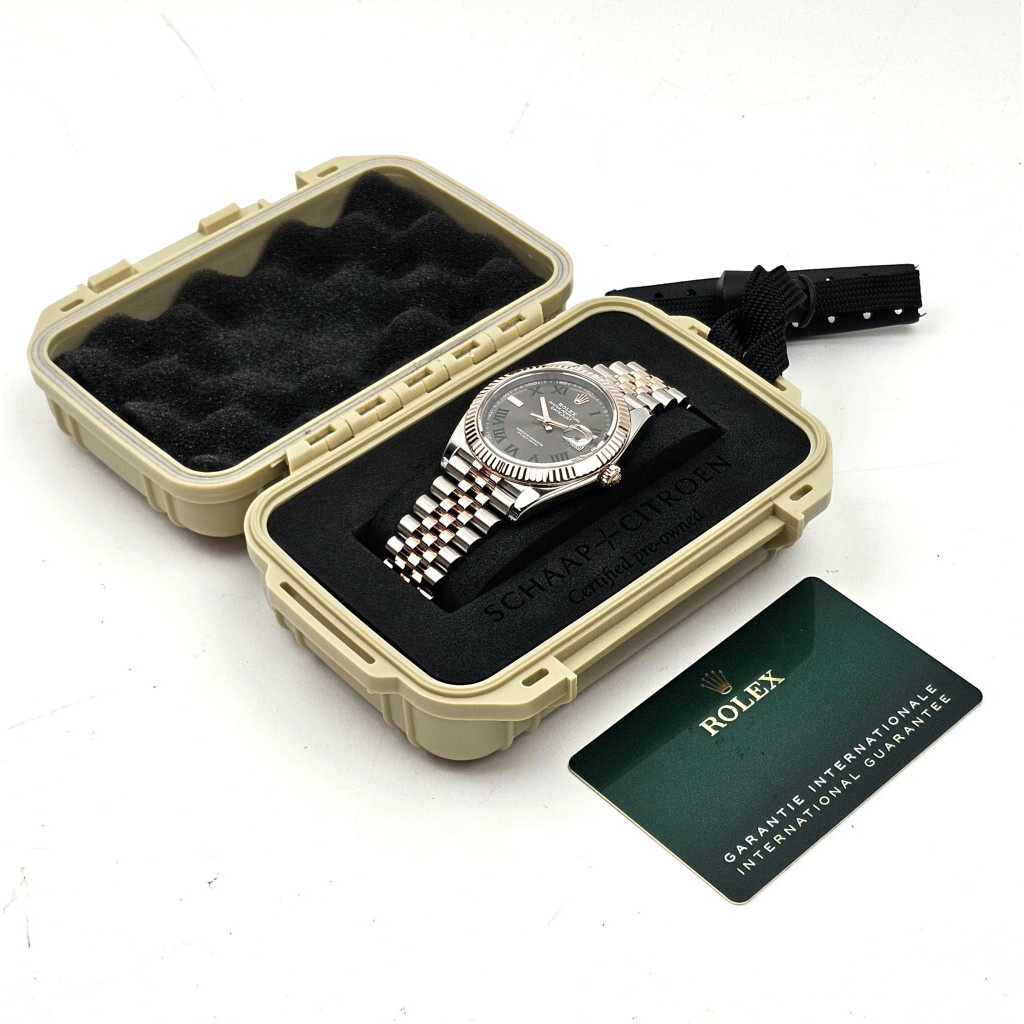 In very good condition Rolex Datejust 41 in steel and rose gold with grey so called 'Wimbledon' dial, rose gold fluted bezel and steel and rose gold Jubilee bracelet from 2023 complete with papers, no box