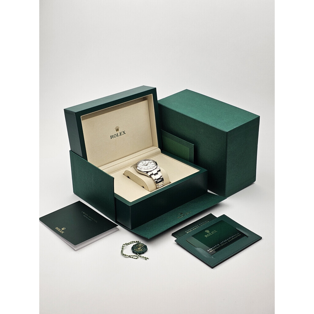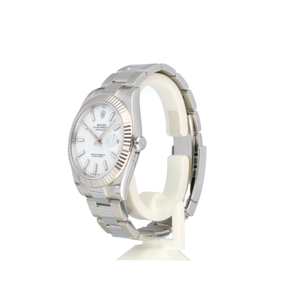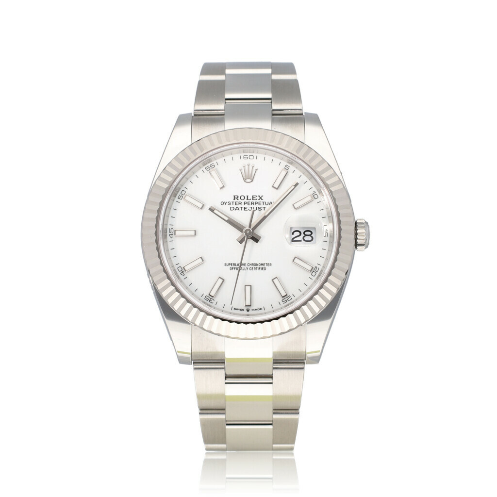 New, unworn Rolex Datejust 41 in steel with white dial, white gold bezel and steel Oyster bracelet from 2025 complete with box and papers.