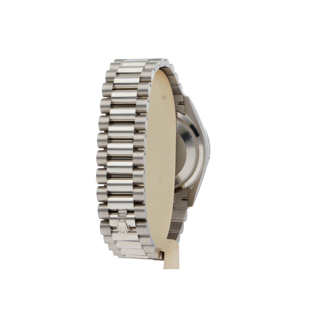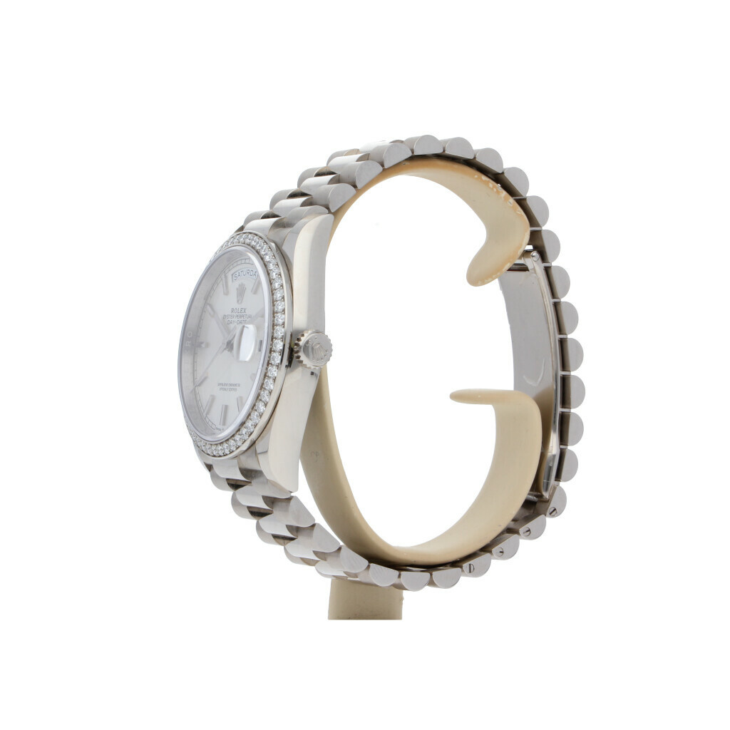 Unworn Rolex Day-Date in white gold with silver dial, factory diamond bezel and President bracelet. No box an/or papers.