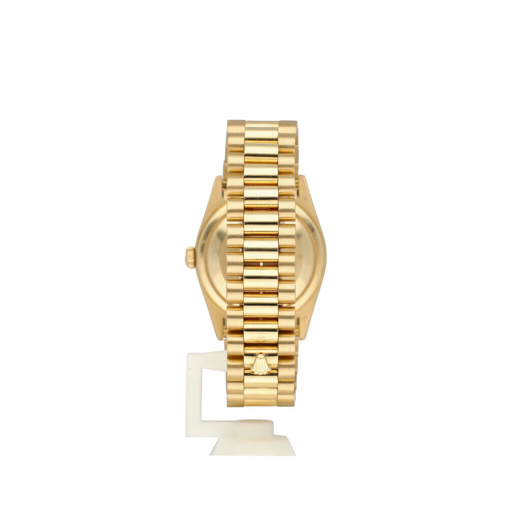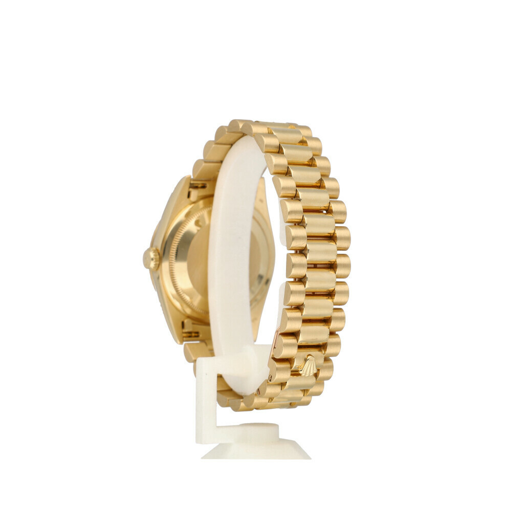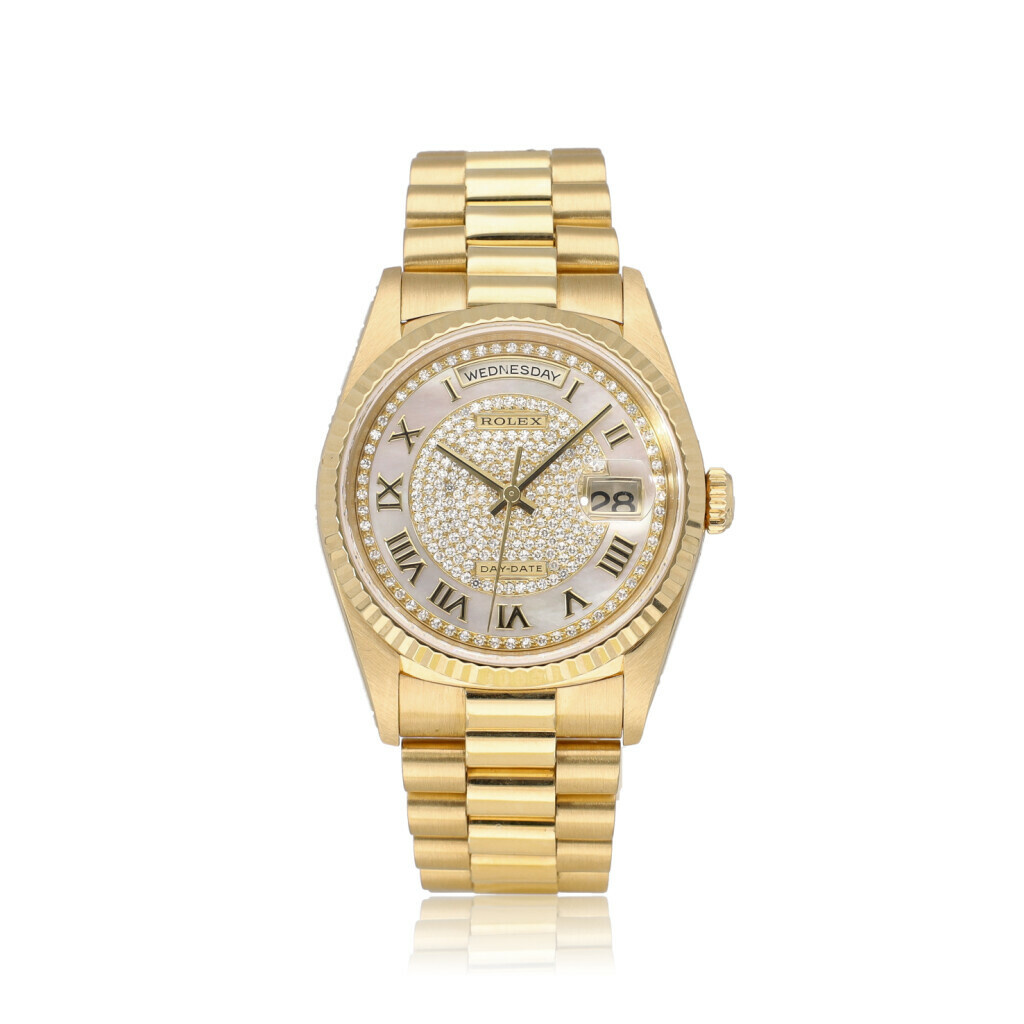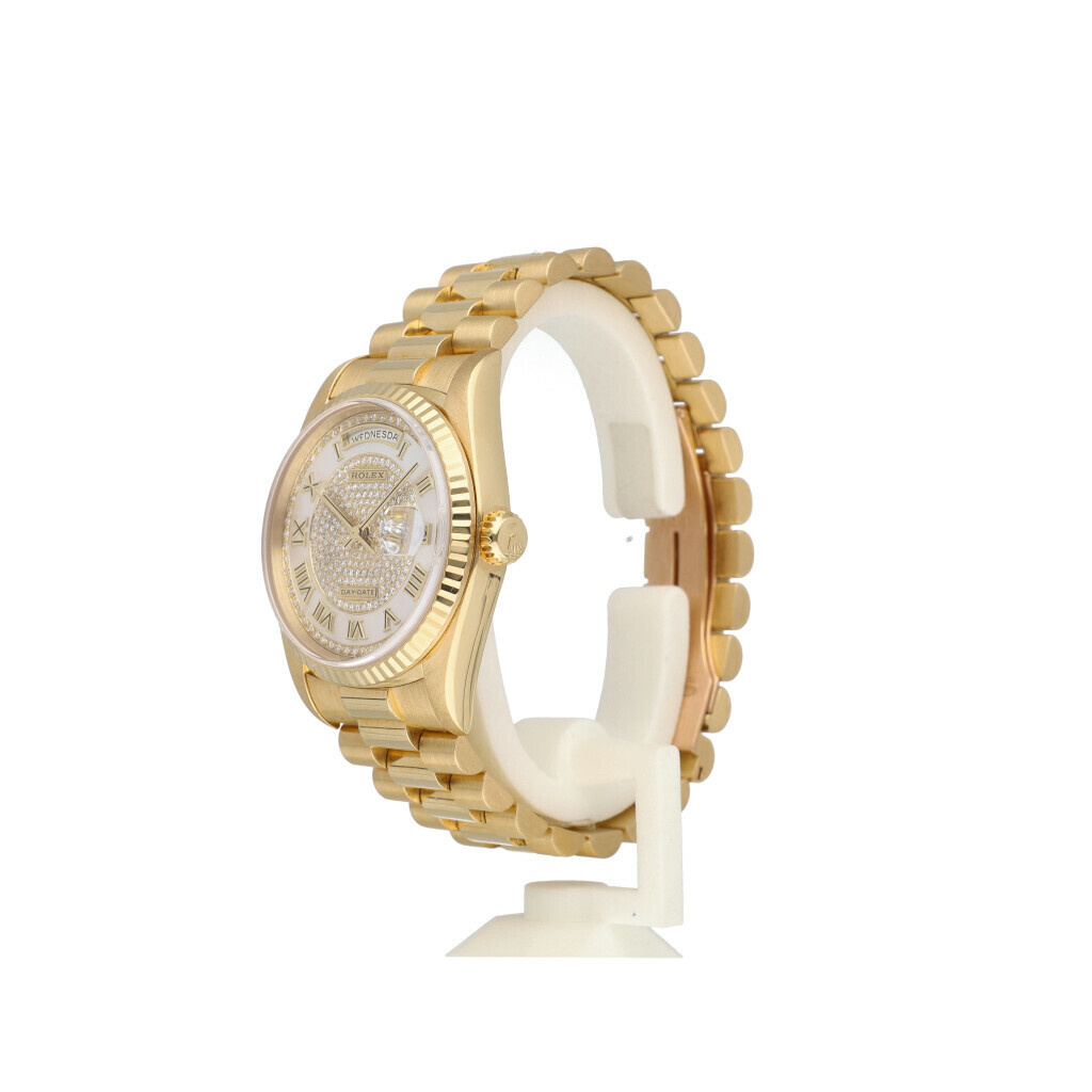In very good condition Rolex Day-Date in yellow gold with rare factory mother or pearl paved diamond, so called carousel dial and yellow gold President bracelet 1999 (6410... serial) complete with papers, no box.