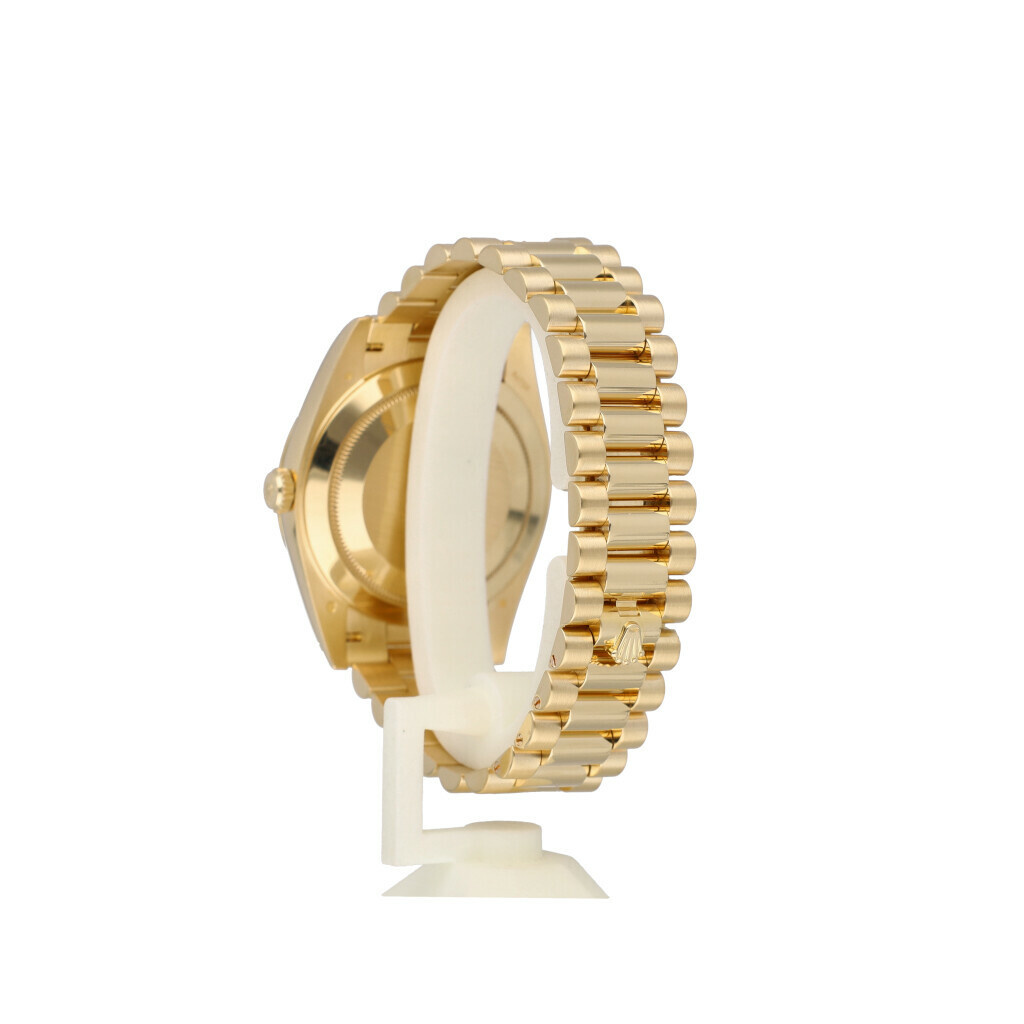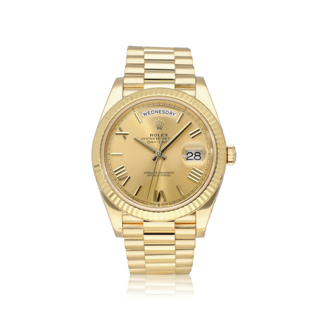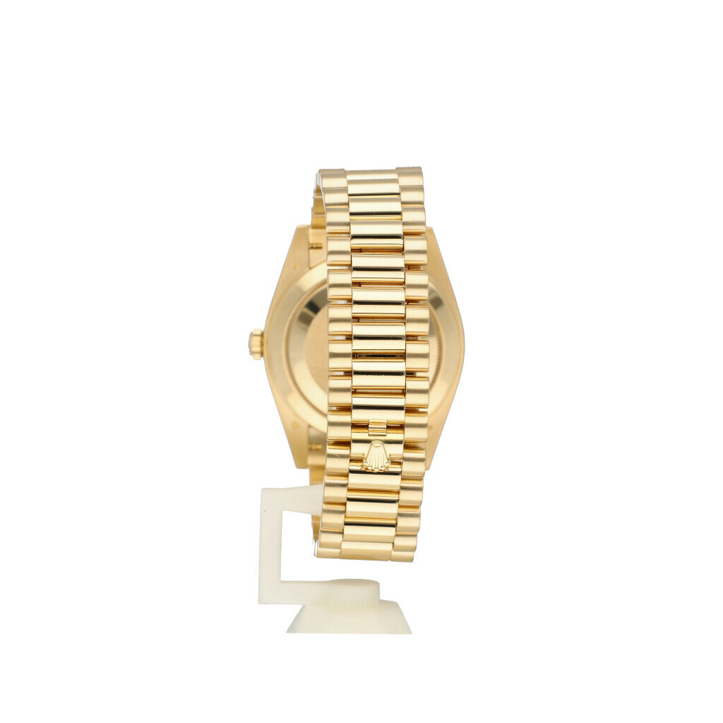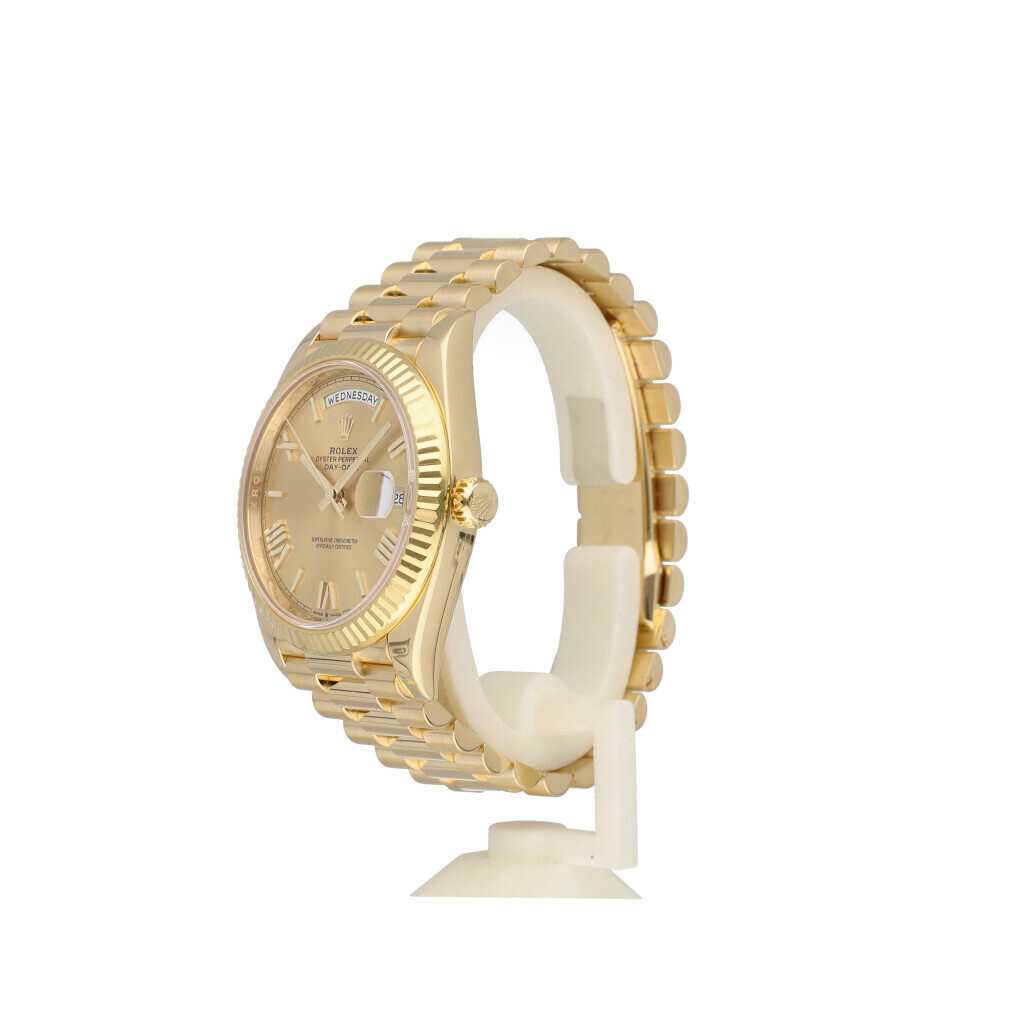 In very condition Rolex Day-Date 40mm in yellow gold with champagne dial and President bracelet from 2020 complete with box and papers.