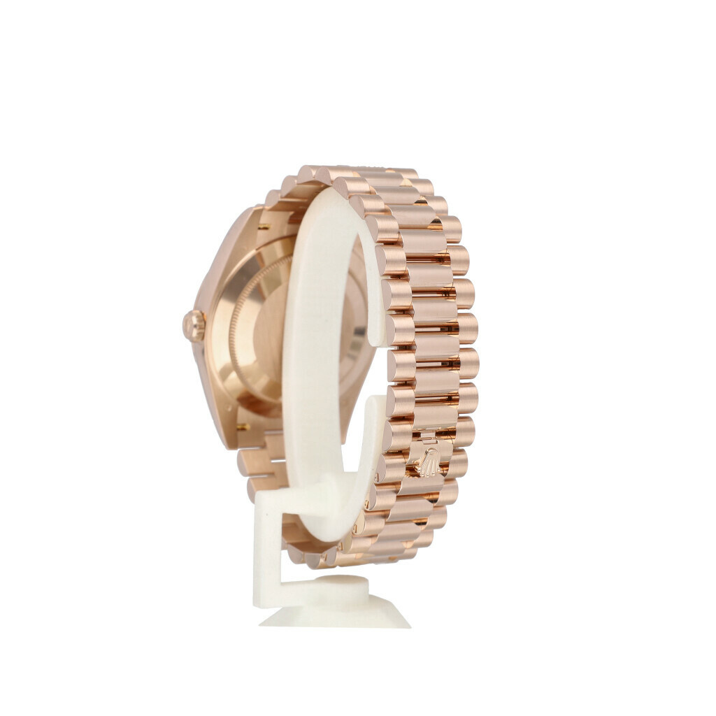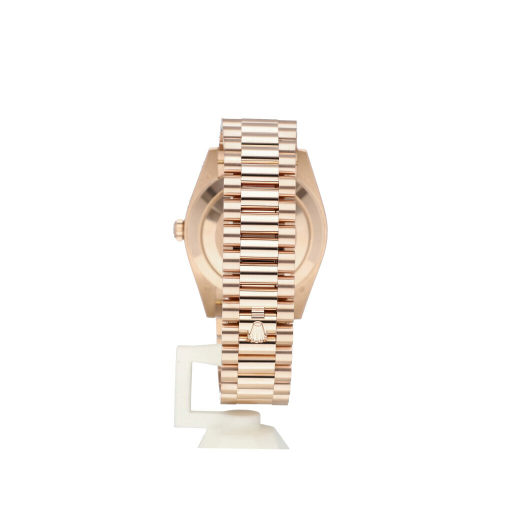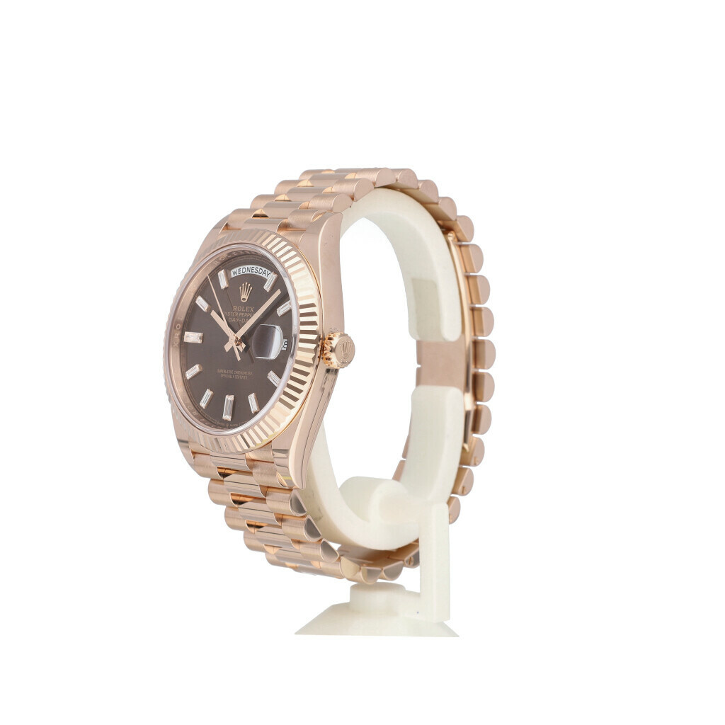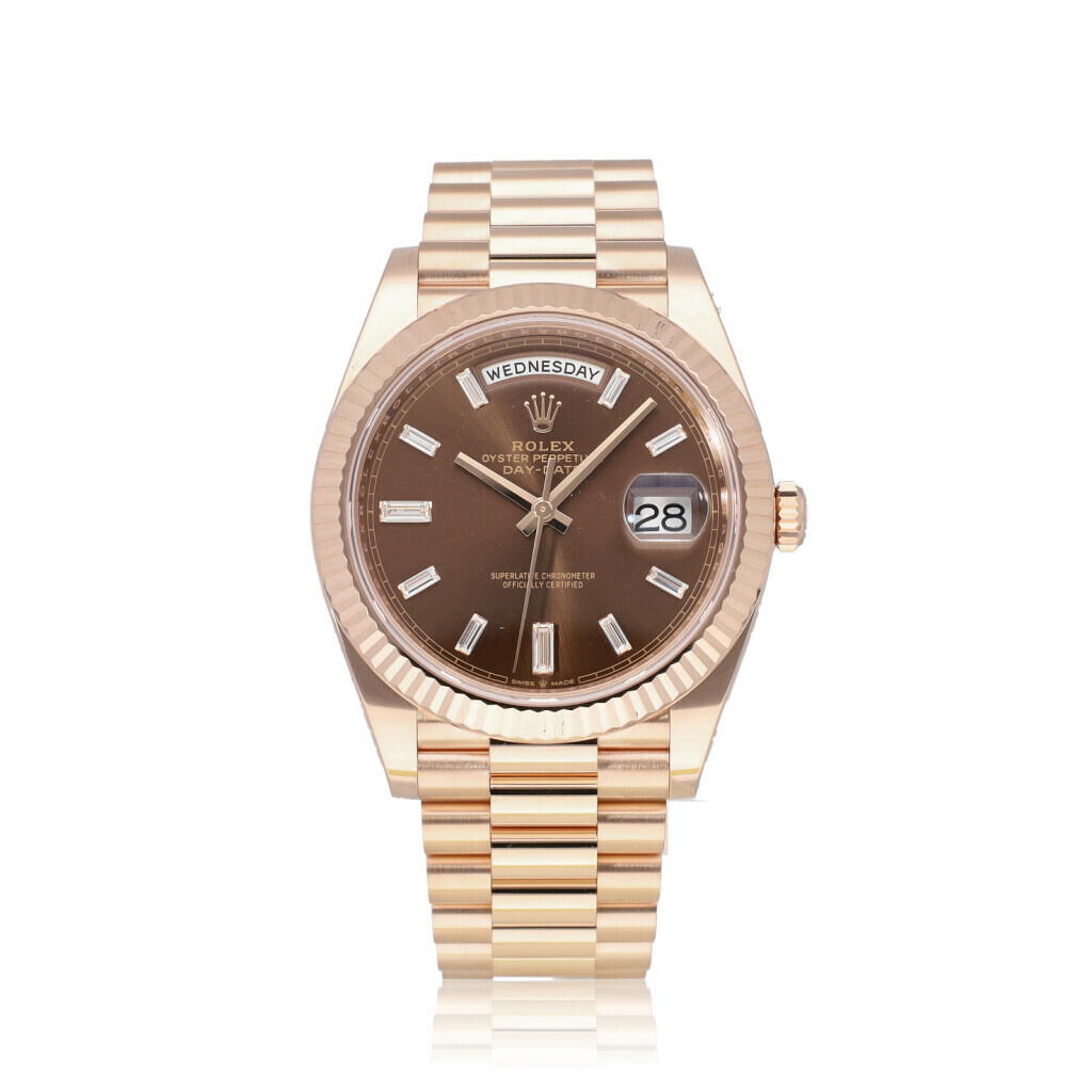 In very good condition Rolex Day-Date 40 in rose gold with factory choco diamond / baguette dial and rose gold President bracelet from 2023 complete with box and papers.