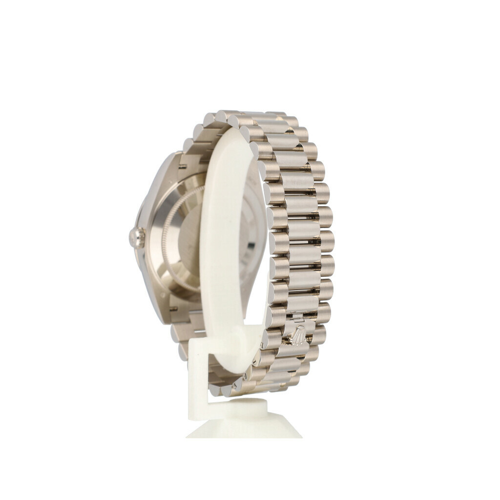 In very good condition Rolex Day-Date in white gold with green so called 'money' dial, factory diamond white gold bezel and white gold President bracelet from 2025 complete with box and papers. 21% VAT deductible when shipped outside of the European Union.