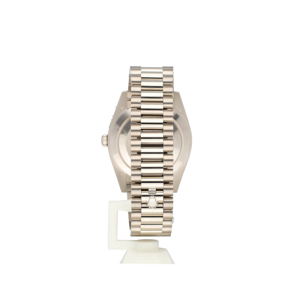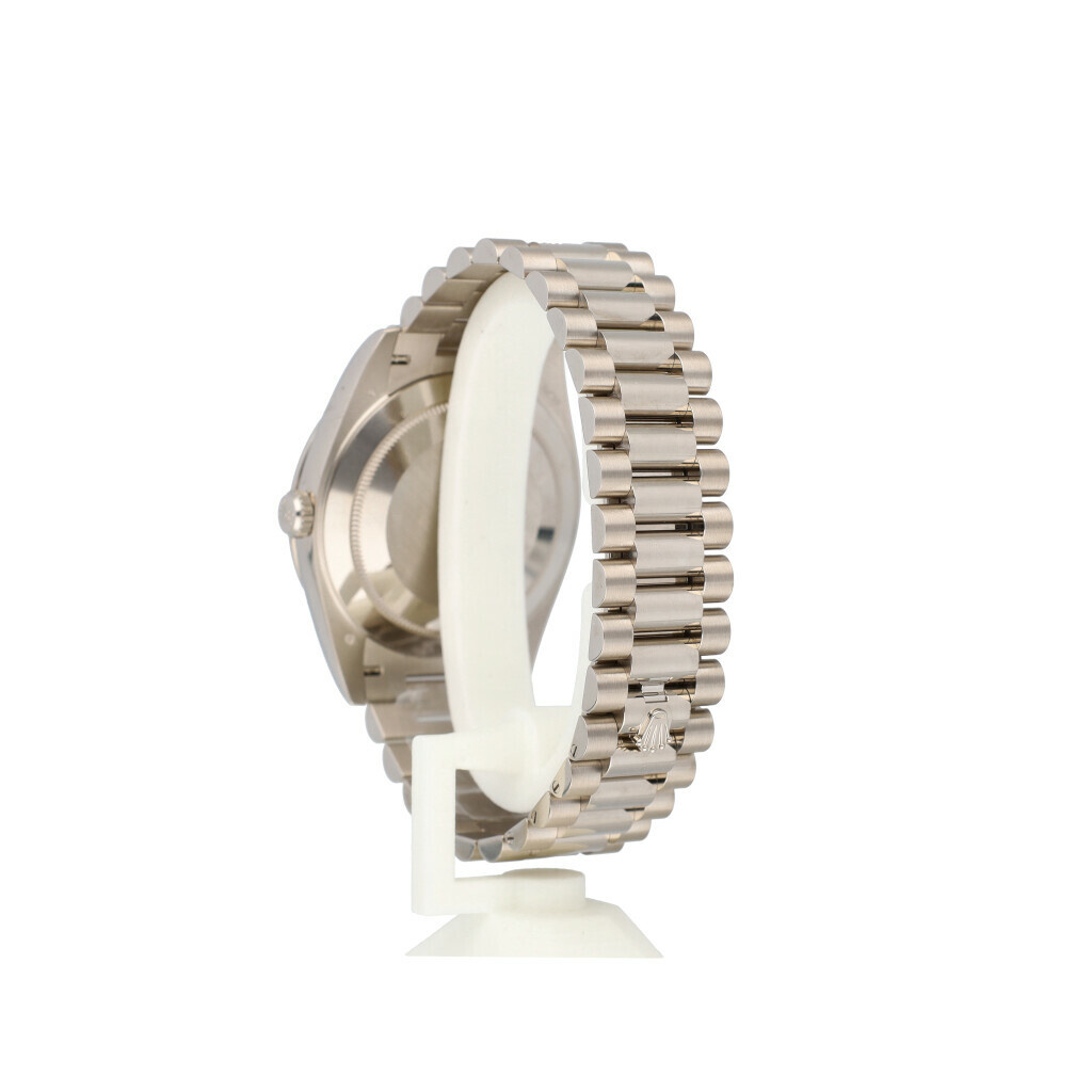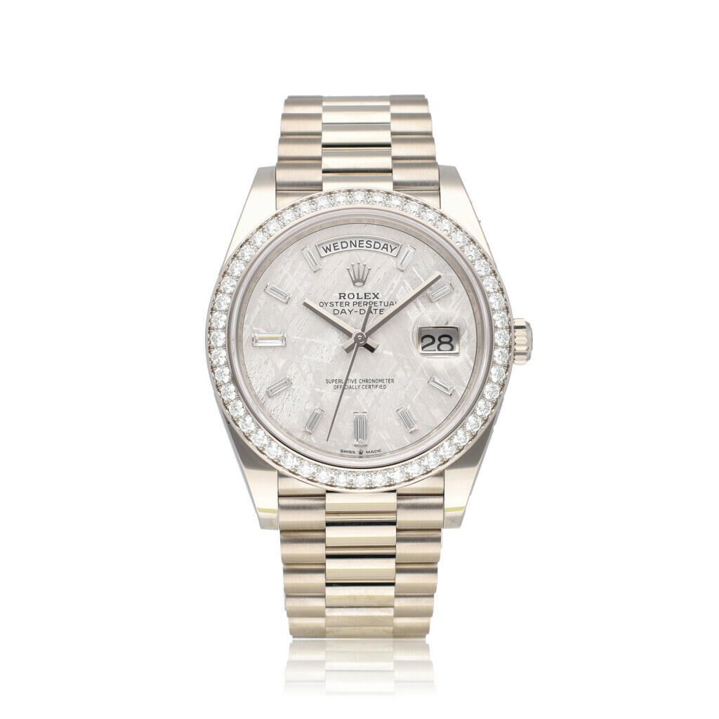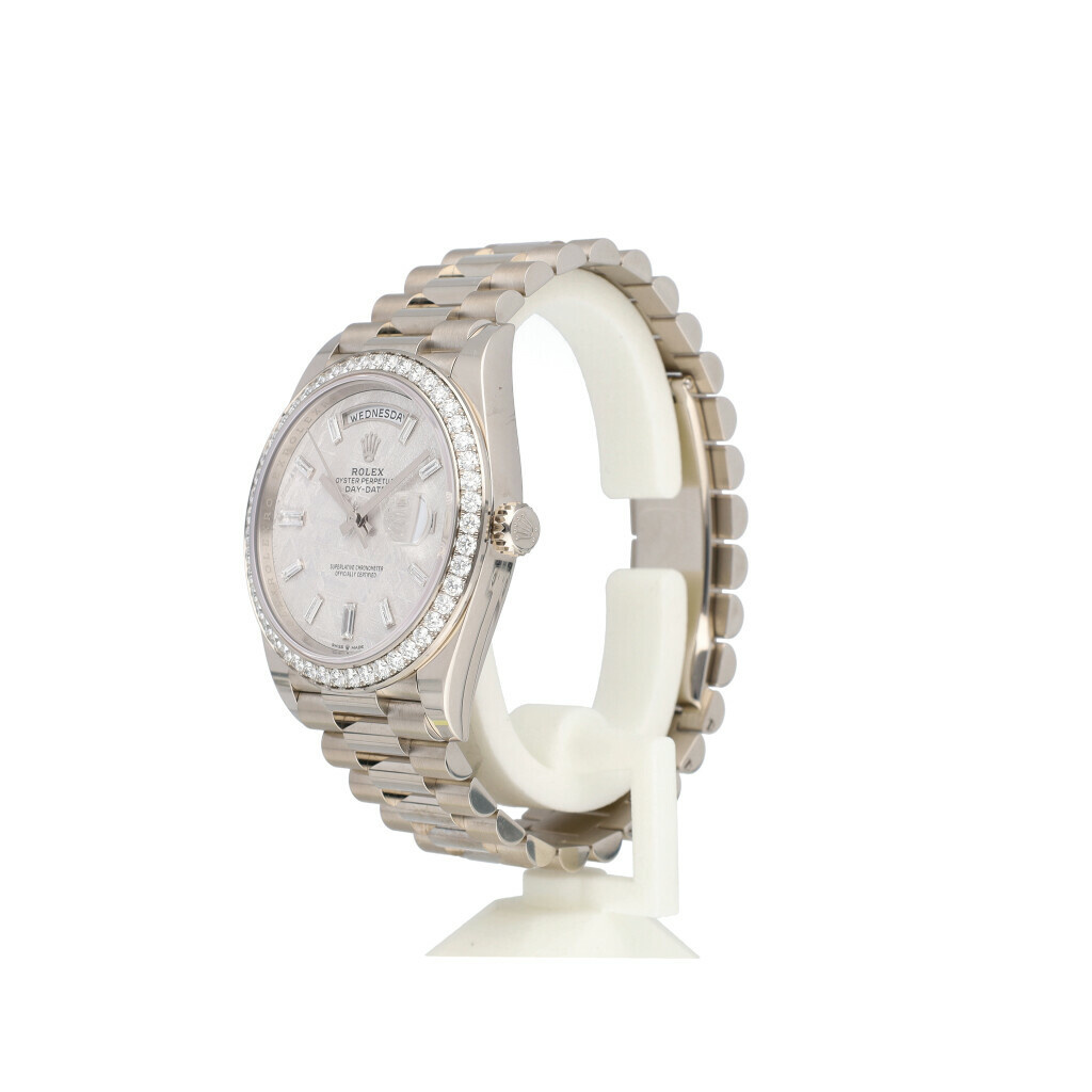 In very good condition Rolex Day-Date in white gold with factory diamond meteorite dial, factory white gold diamond bezel and white gold President bracelet from 2026 complete with box and papers. 21% VAT deductible when shipped outside of the European Union.