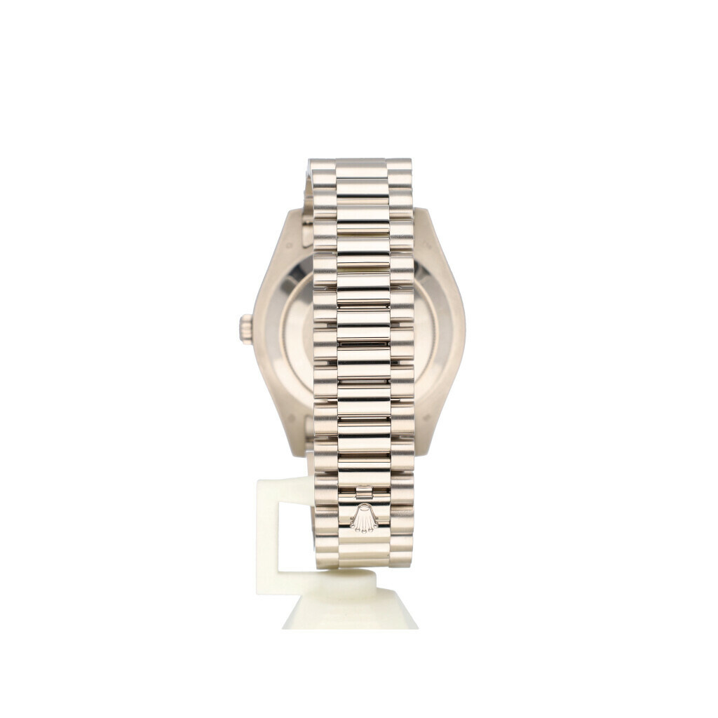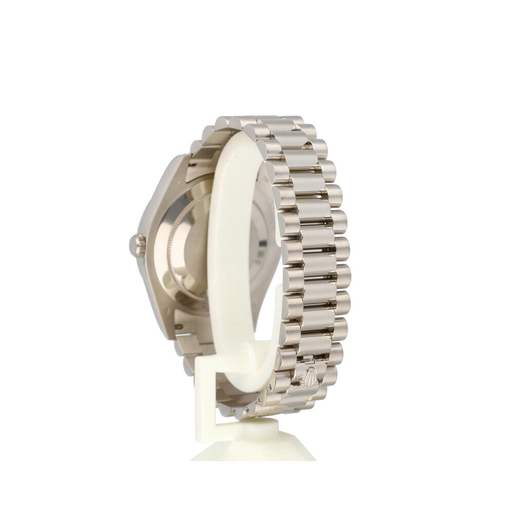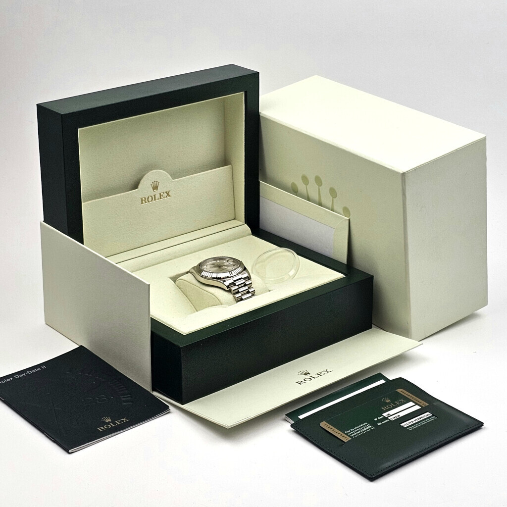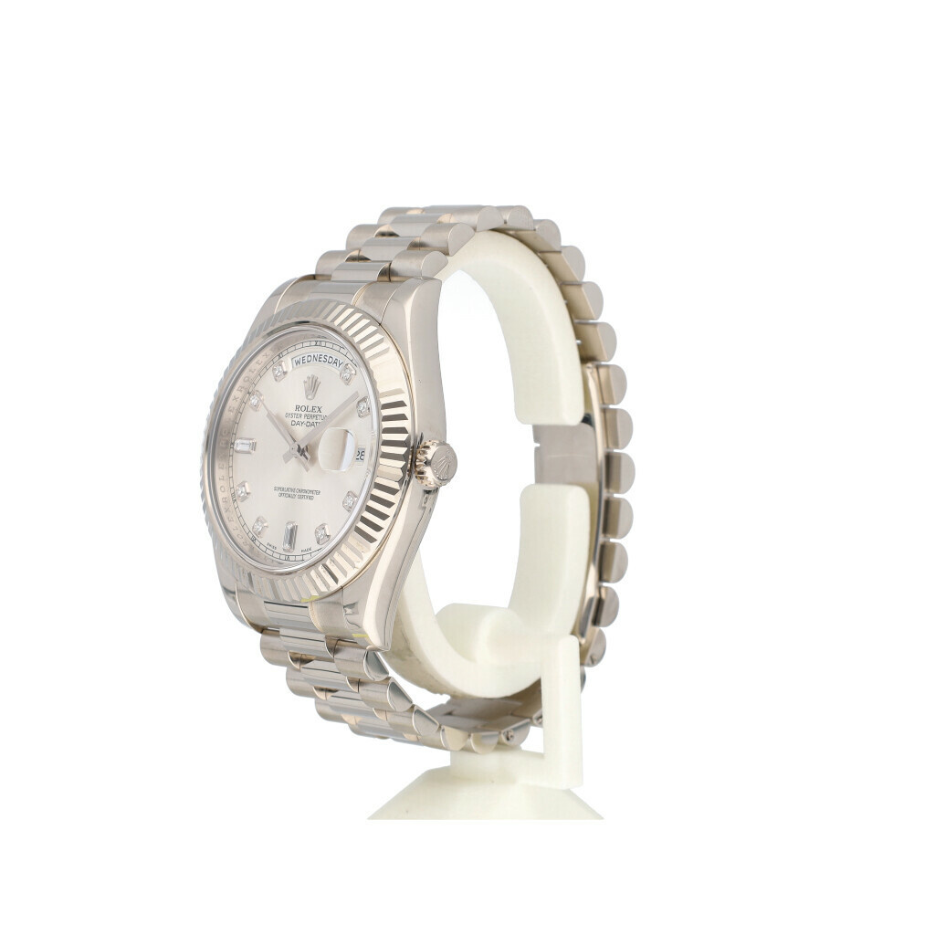 In very good condition Rolex Day-Date II 41 in white gold with factory silver diamond / baguette dial, white gold fluted bezel and white gold President bracelet from 2010 (V418... serial) complete with box and papers.