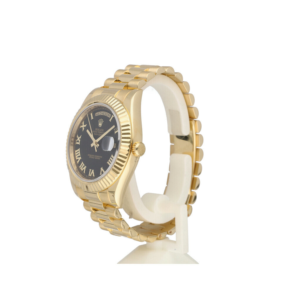 In very good condition Rolex Day-Date II in yellow gold with black roman dial, yelow gold fluted bezel and yelow gold President bracelet from 2014 complete with box and papers. Rolex serviced 8-2025 and not worn since. Rolex service certificate included.