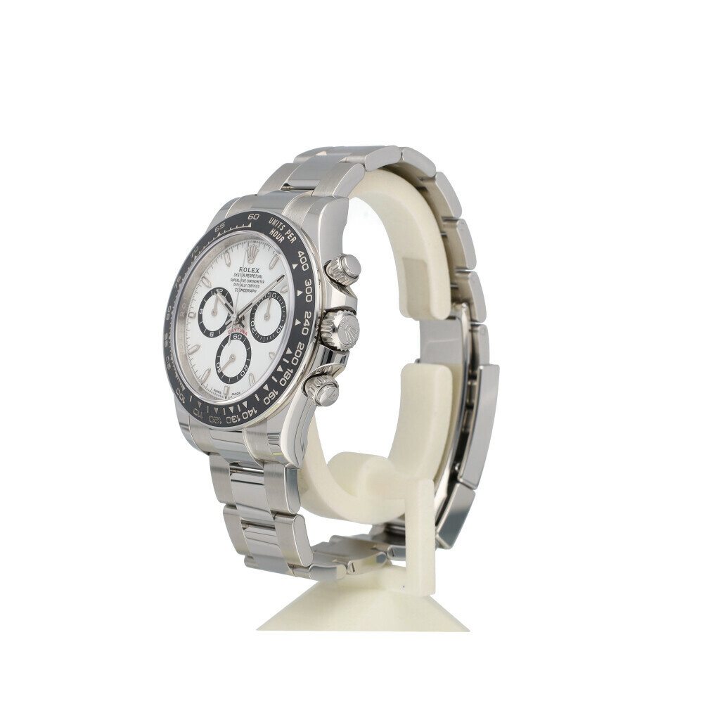 In very good condition Rolex Daytona chronograph in steel with white so called 'panda' dial, black ceramic bezel and steel Oyster bracelet from 2025 complete with box and papers.