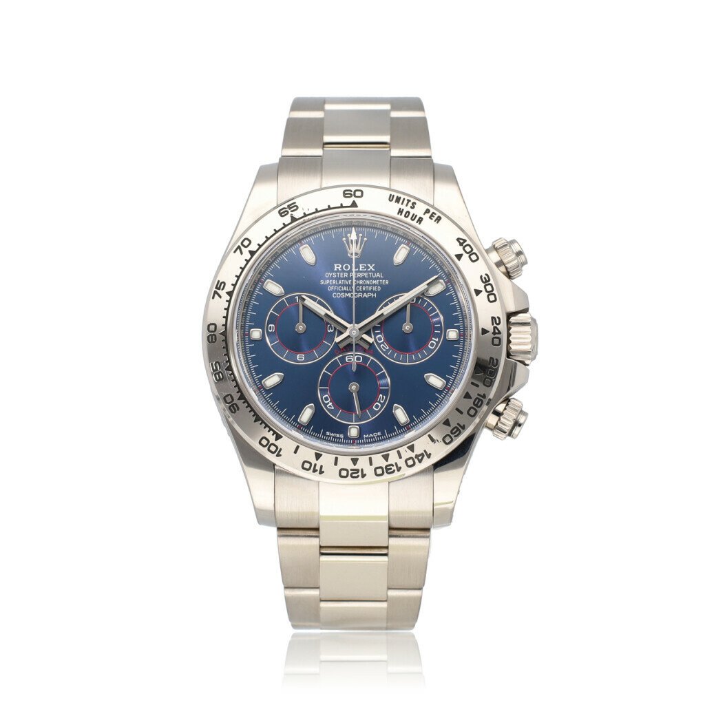 In very good condition Rolex Daytona in white gold with blue dial from 2021 complete with box and papers.