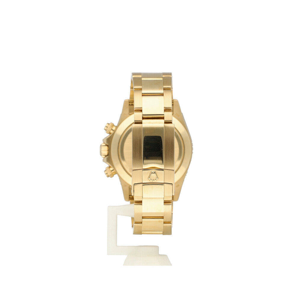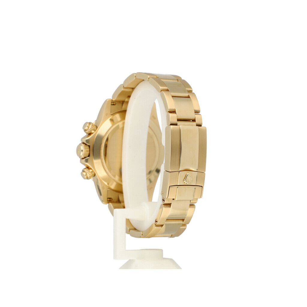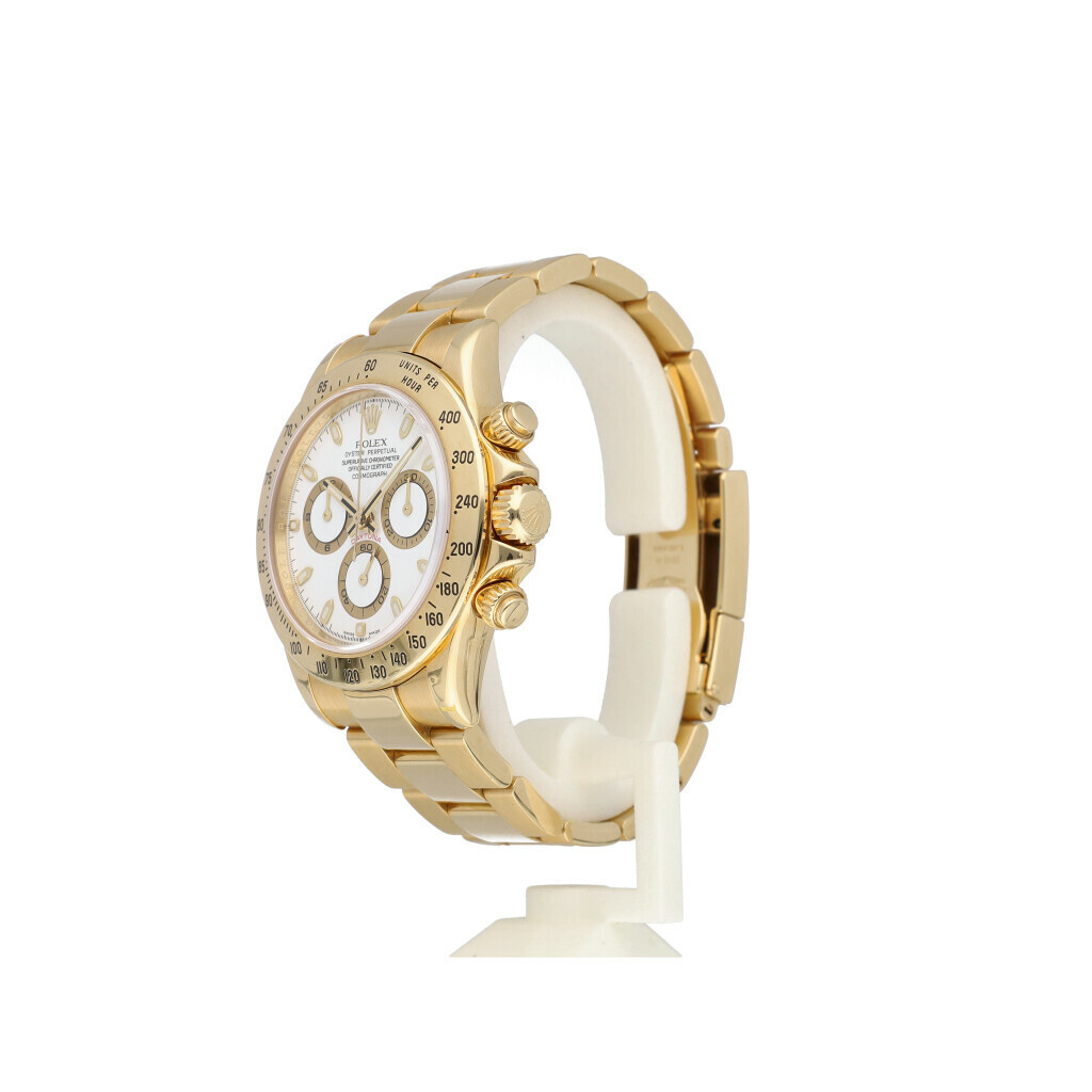 In very good condition Rolex Daytona in yellow gold with white coloured dial, yellow gold bezel and yellow gold Oyster bracelet from +/- 2007 (Z785... serial). No box and/or papers. Complete with Rolex service certificate from 2022. Hardly worn since.