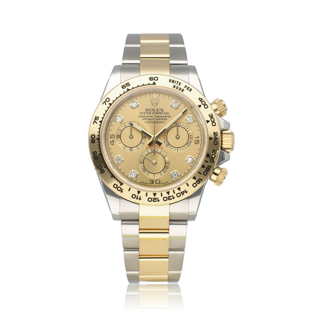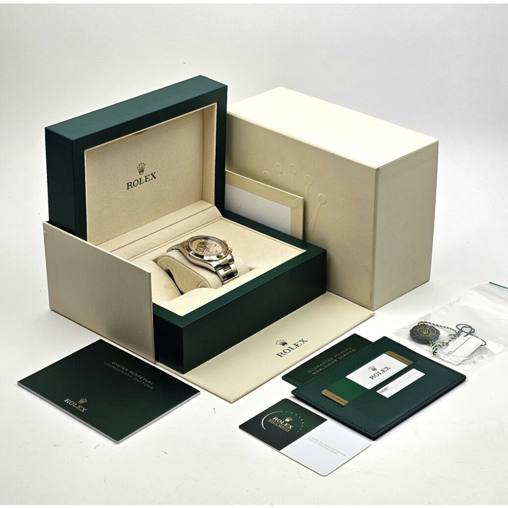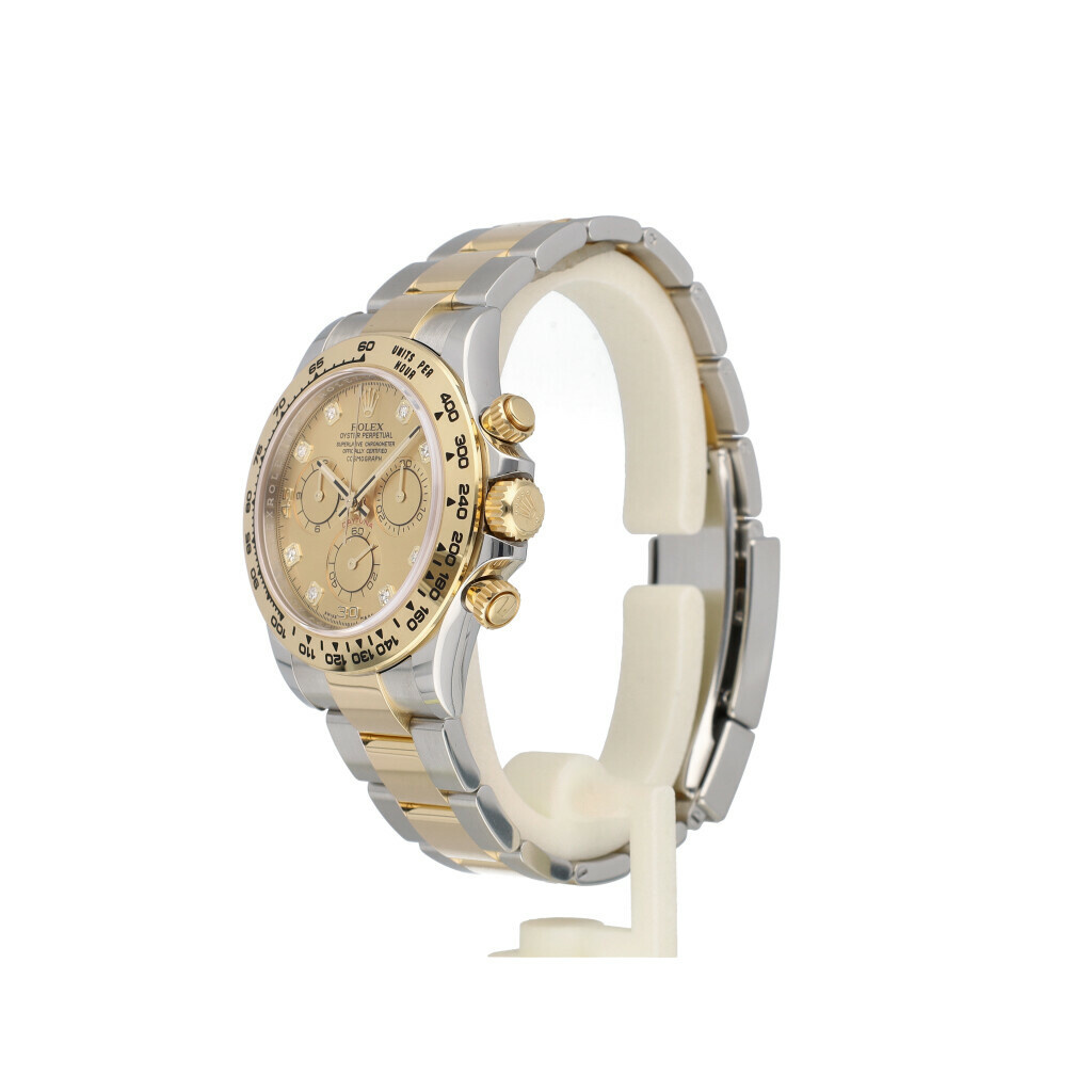 In very good condition Rolex Daytona in steel and yellow gold with champagne diamond dial from 2020 complete with box and papers. Rolex serviced 1-2026 and not worn since. Rolex service certificate included.