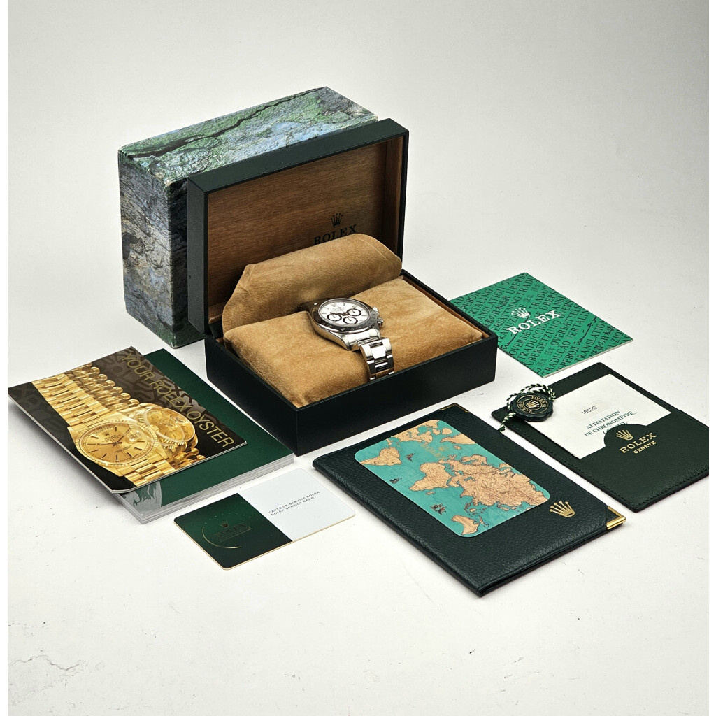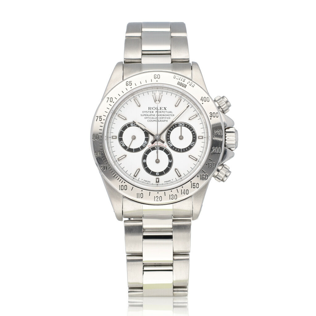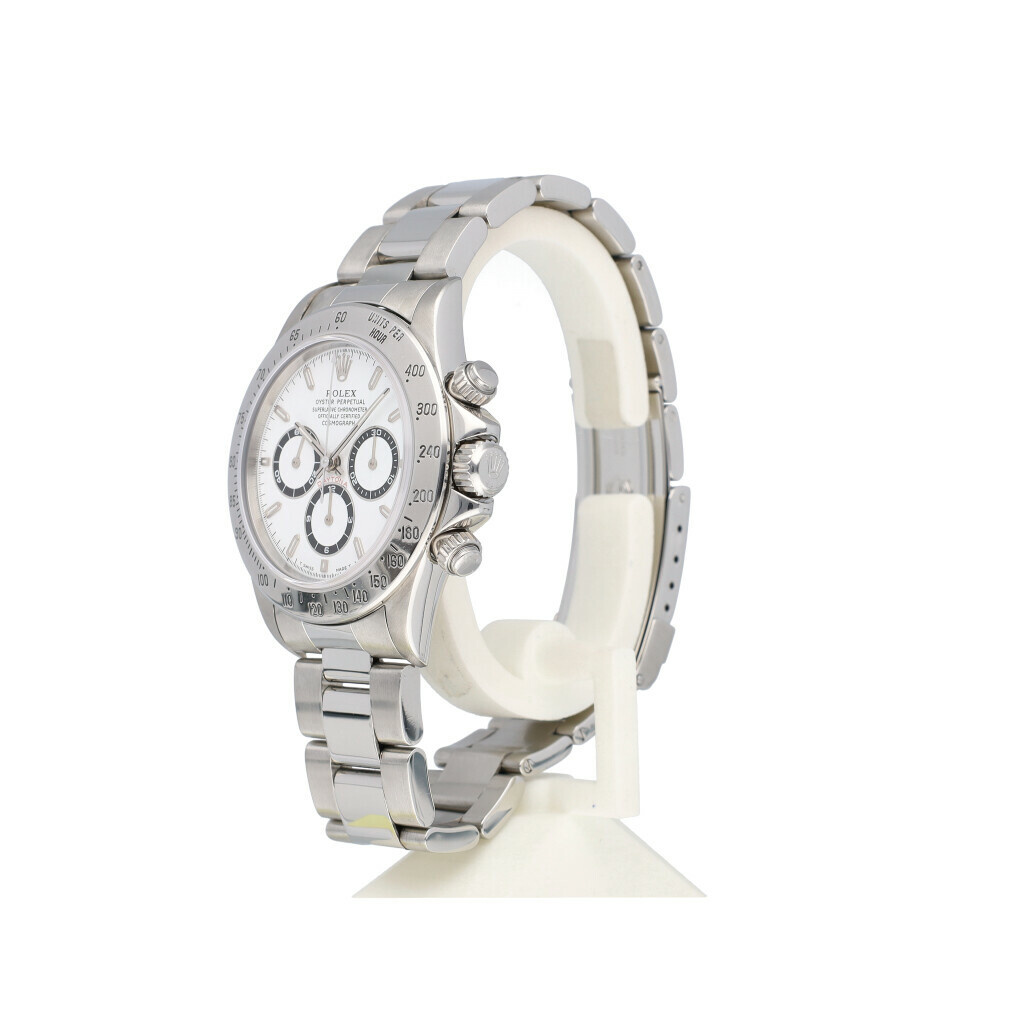 In very good condition Rolex Daytona in steel with Zenith movement white dial and steel Oyster bracelet from 1997 complete with box and papers. Rolex serviced 6-2025 and not worn since. Rolex service certificate included.