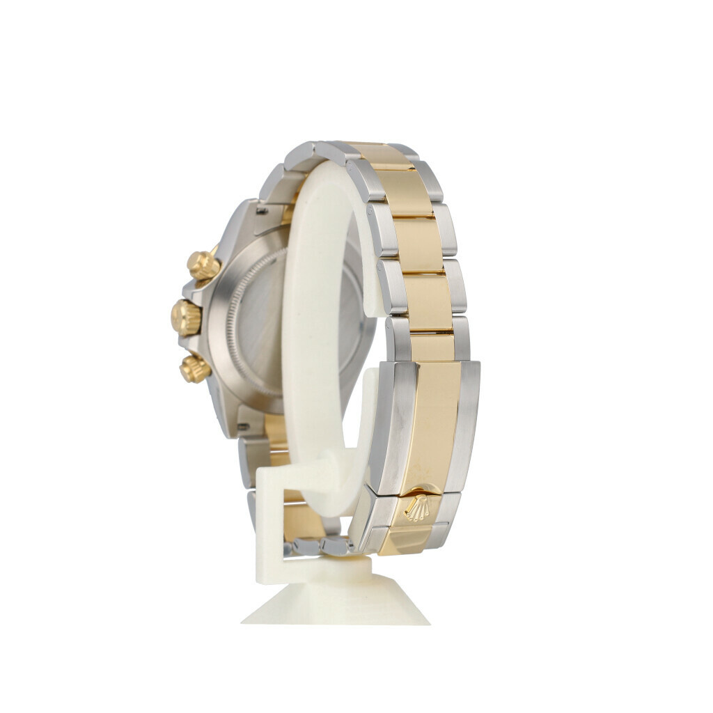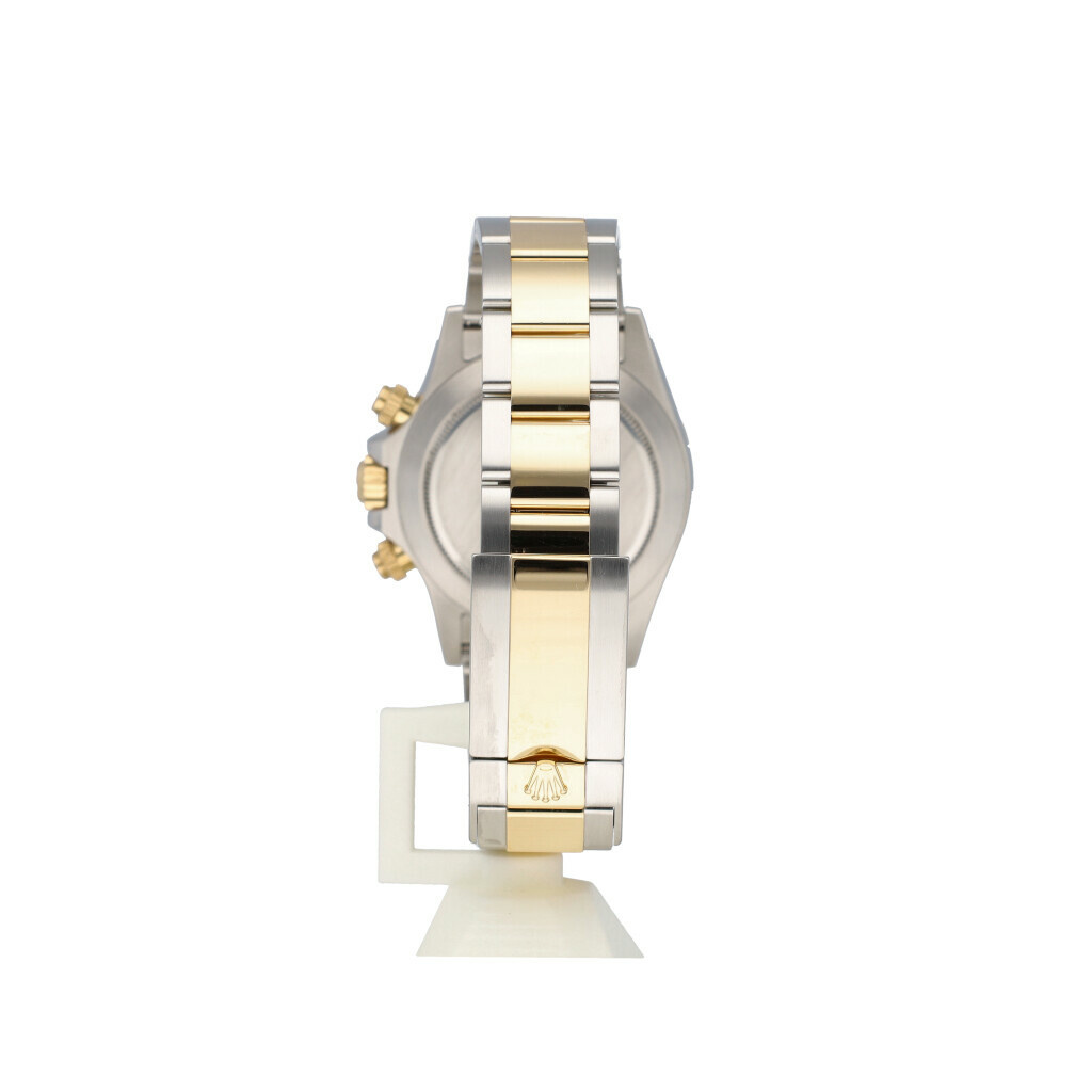In very good condition Rolex Daytona in steel and yellow gold with factory black diamond dial, yellow gold bezel and steel and yellow gold Oyster bracelet from 2015 complete with box and papers. Rolex serviced 11-2020 and hardly worn since. Rolex service certificate included.
