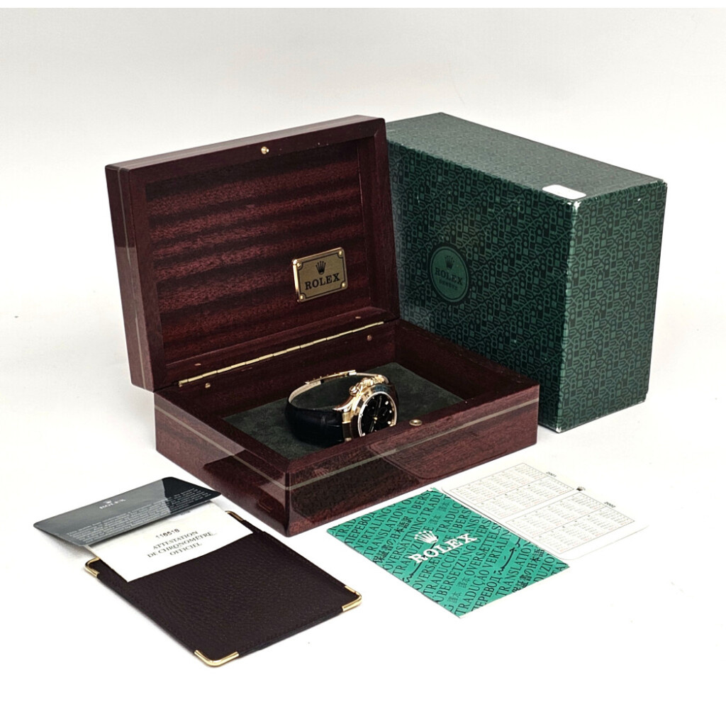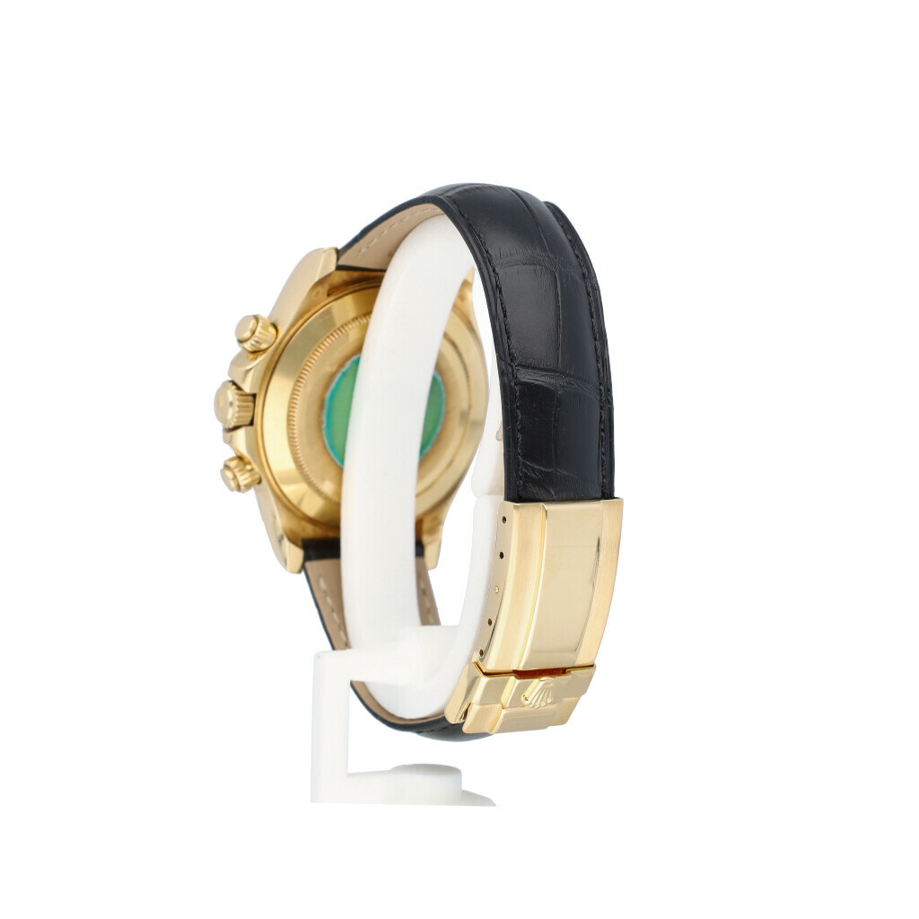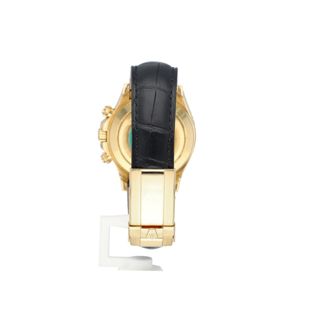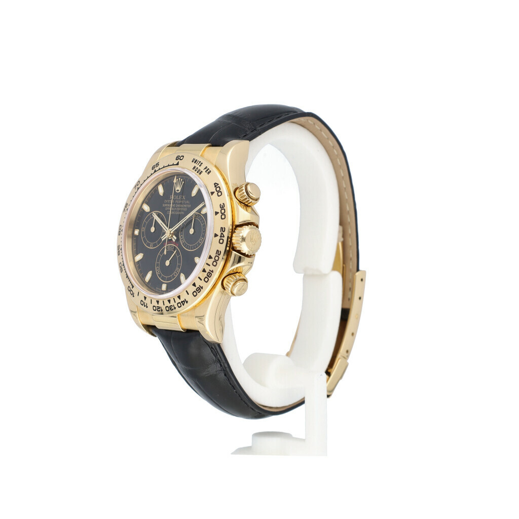 In very good condition Rolex Daytona in yellow gold with black dial and black leather strap from 2002 complete with box and papers. Comes with new Rolex strap, not worn since.