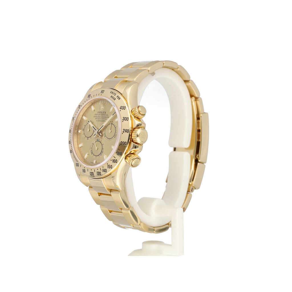 In very good condition Rolex Daytona in yellow gold with champagne coloured dial and yellow gold Oyster bracelet from 2011 complete with box and papers. Rolex serviced 6-2025 and not worn since. Rolex service certificate included.