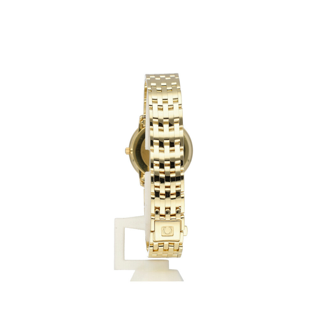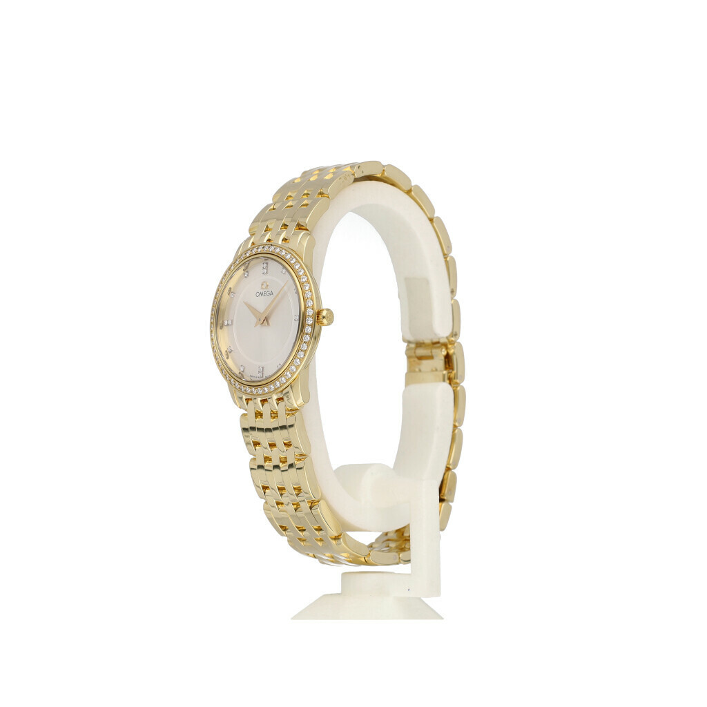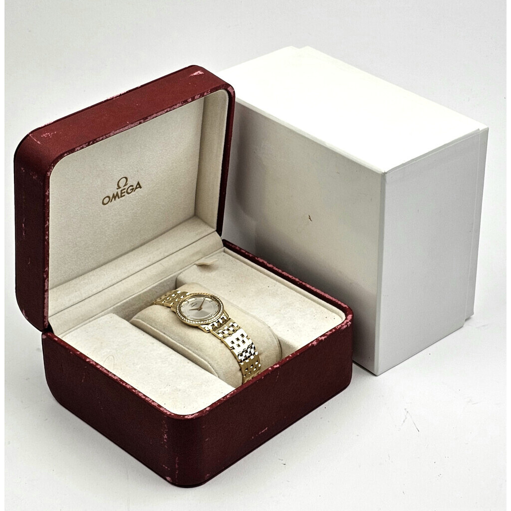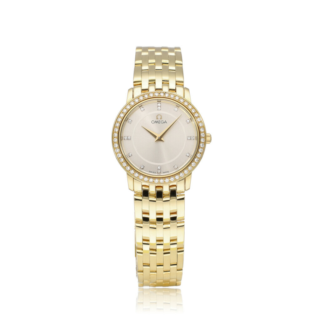 In very good condition Omega De Ville Prestige in yellow gold with factory diamond set bezel and silver factory set diamond dial complete with box, no papers.
