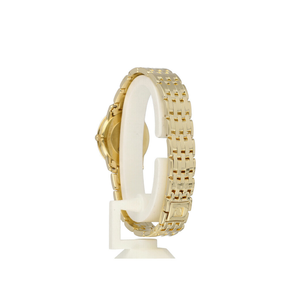 In very good condition Omega De Ville Prestige in yellow gold with factory diamond set bezel and silver factory set diamond dial complete with box, no papers.