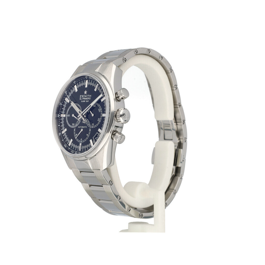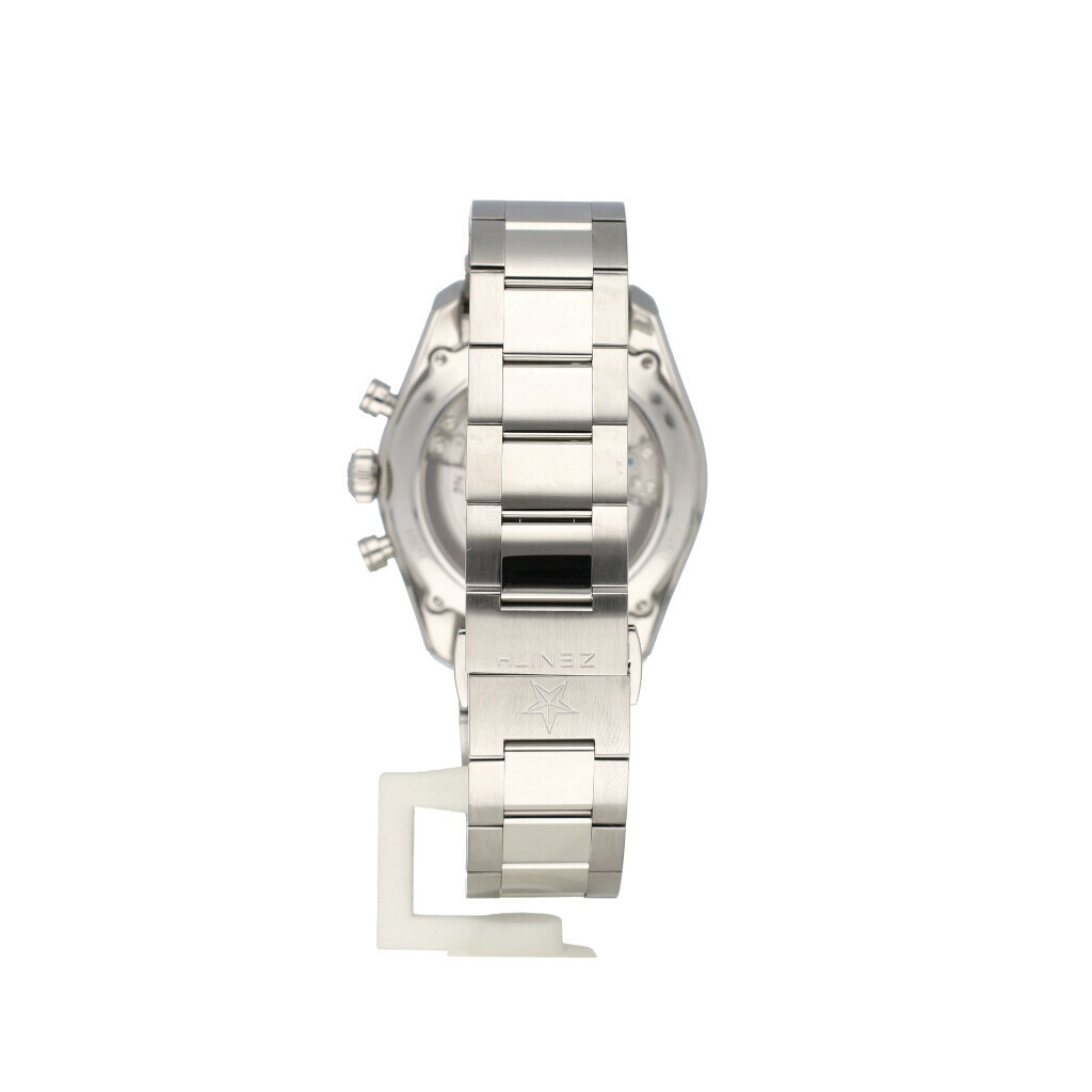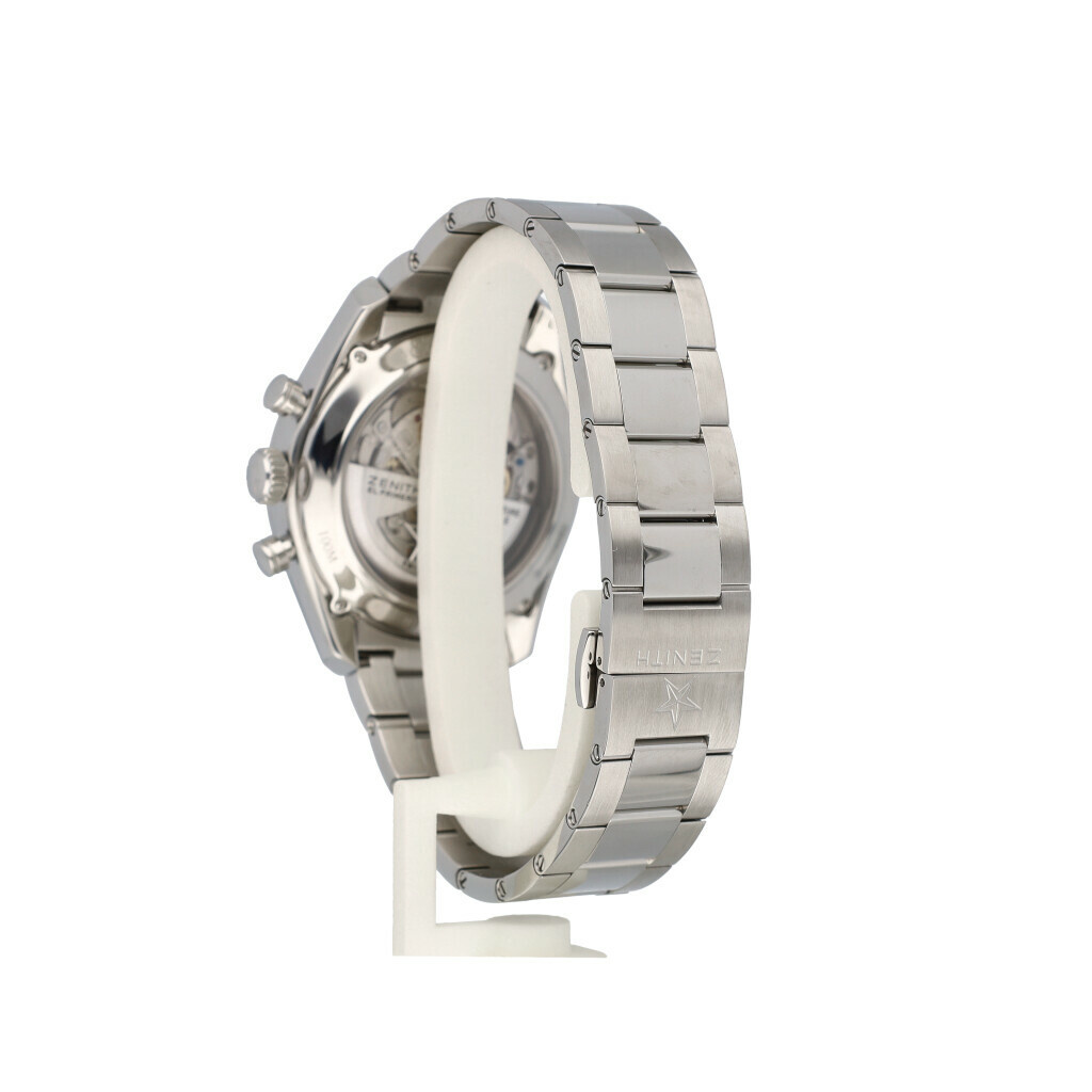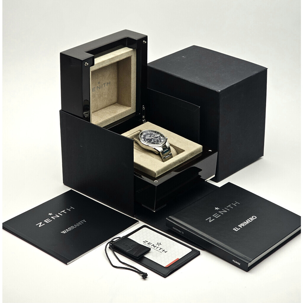 In very good condition Zenith El Primero 36'000 VPH 42 mm in steel with black dial, steel bracelet and leather strap from 2021 complete with box and papers.