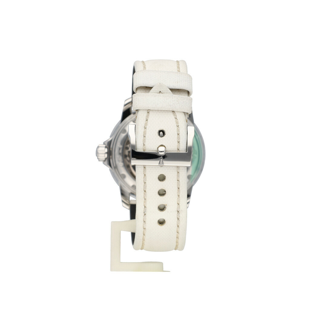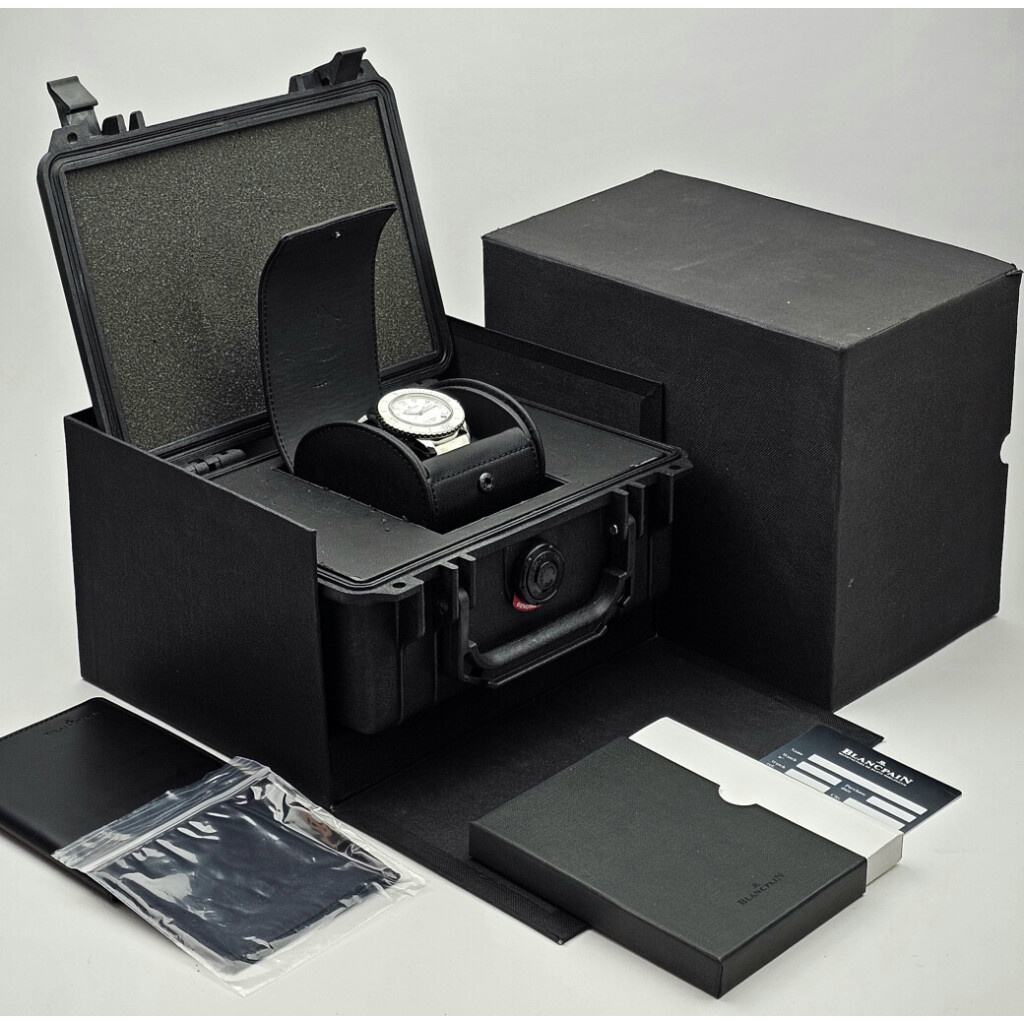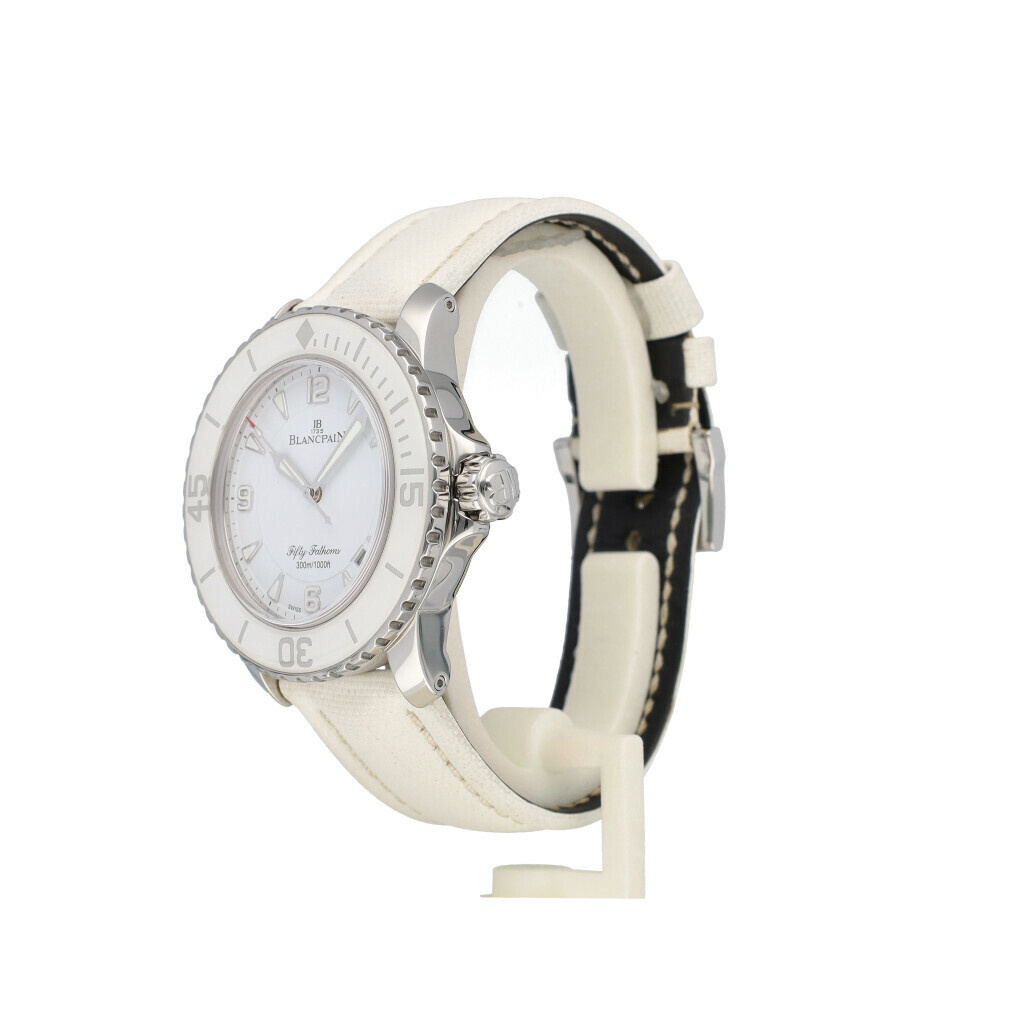 In very good condition Blancpain Fifty Fathoms in steel with white dial and white canvas strap complete with box and papers. No date filled in on certificate.