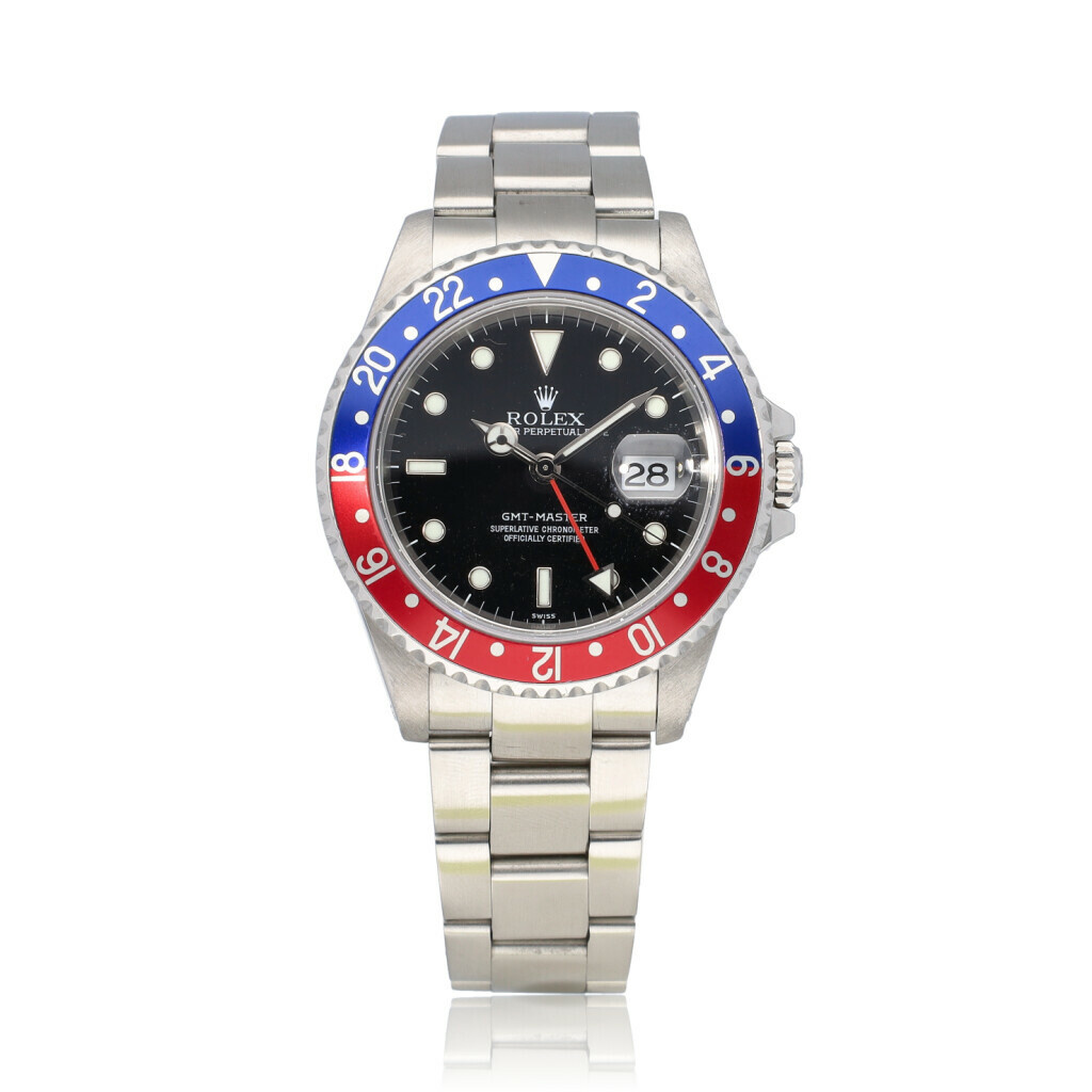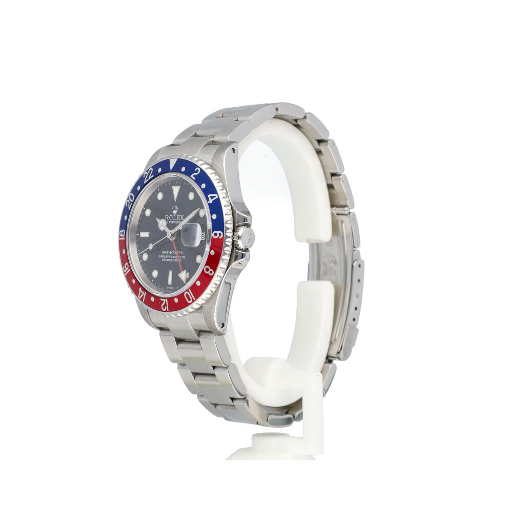 In very good condition Rolex GMT-Master in steel with so called 'Pepsi' blue and red bezel with one of the first 'Swiss only' dials from +/- 1997 (U594... serial) complete with box, no papers.