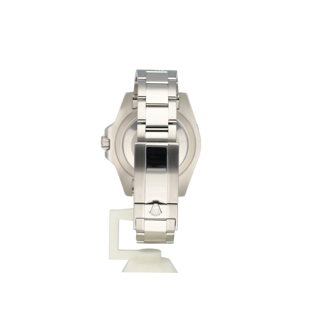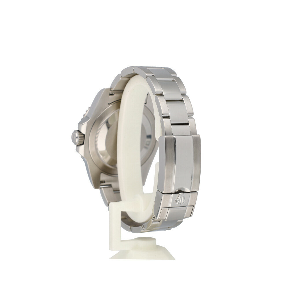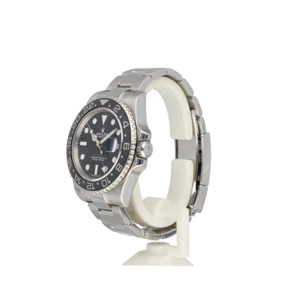 In very good condition Rolex GMT-Master II in steel with black cermic bezel, black dial and steel Oyster bracelet from 2018 complete with box and papers.