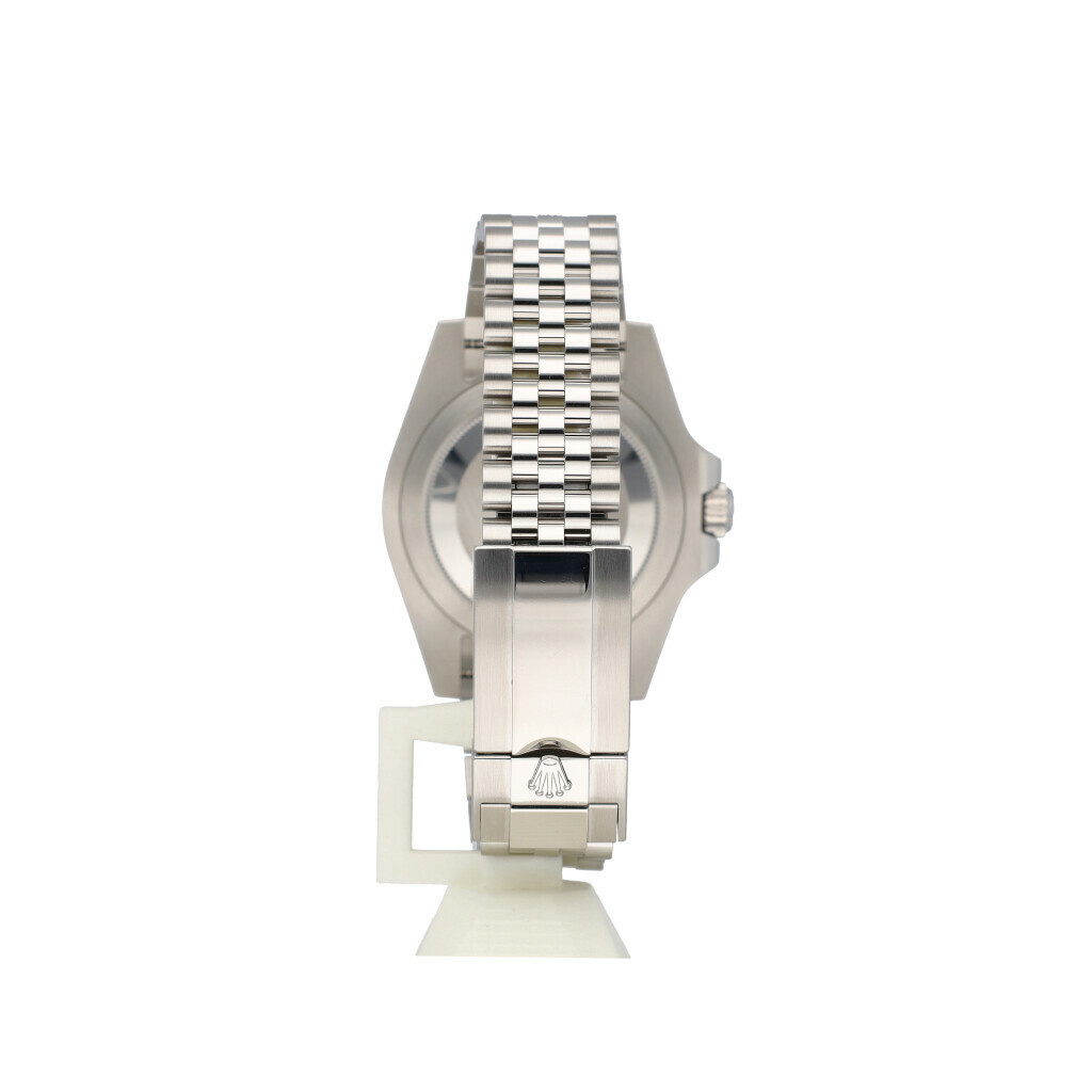 In very good condition Rolex GMT-Master II left handed so called 'Sprite' in steel with black dial, green and black ceramic bezel and steel Jubilee bracelet from 2022 complete with box and papers.