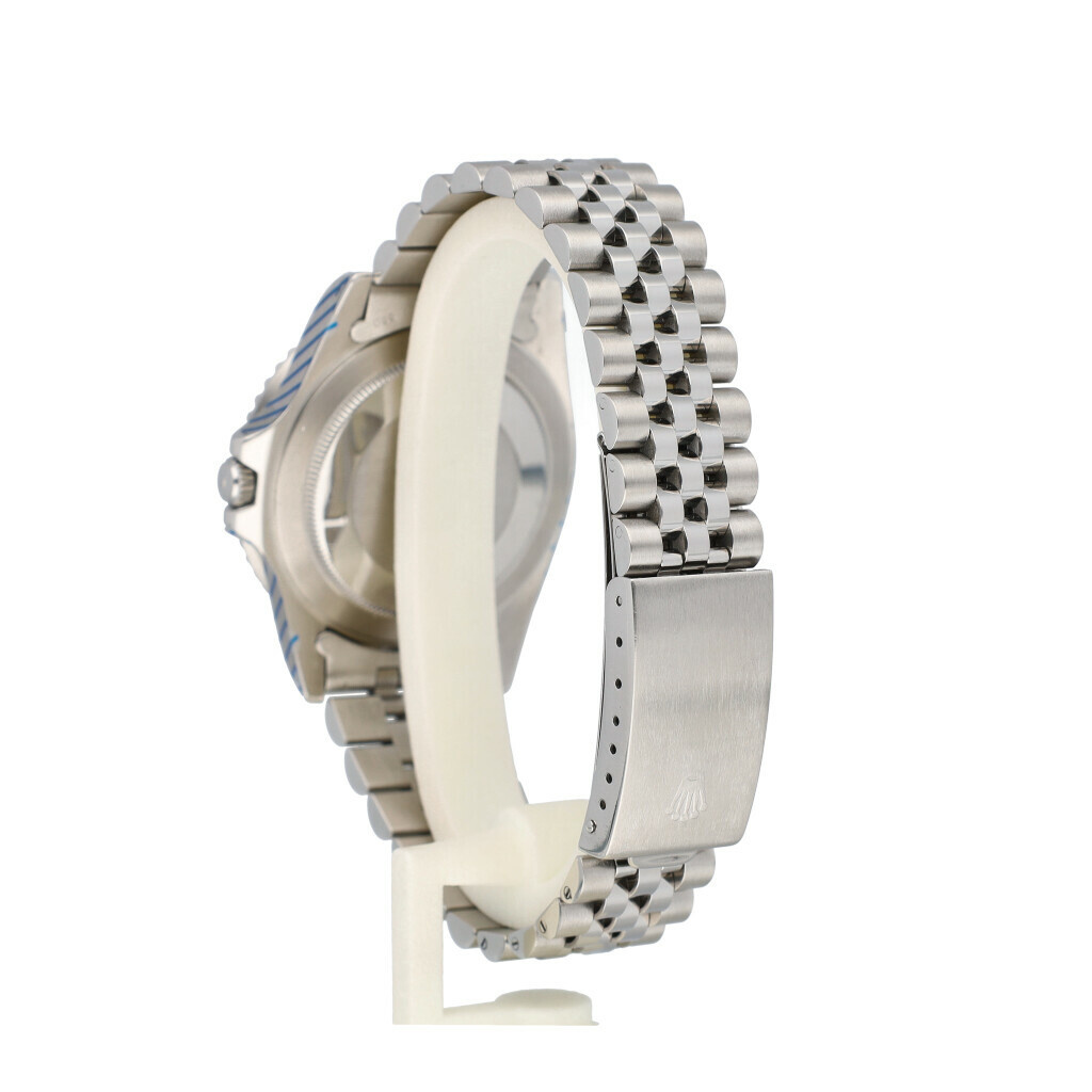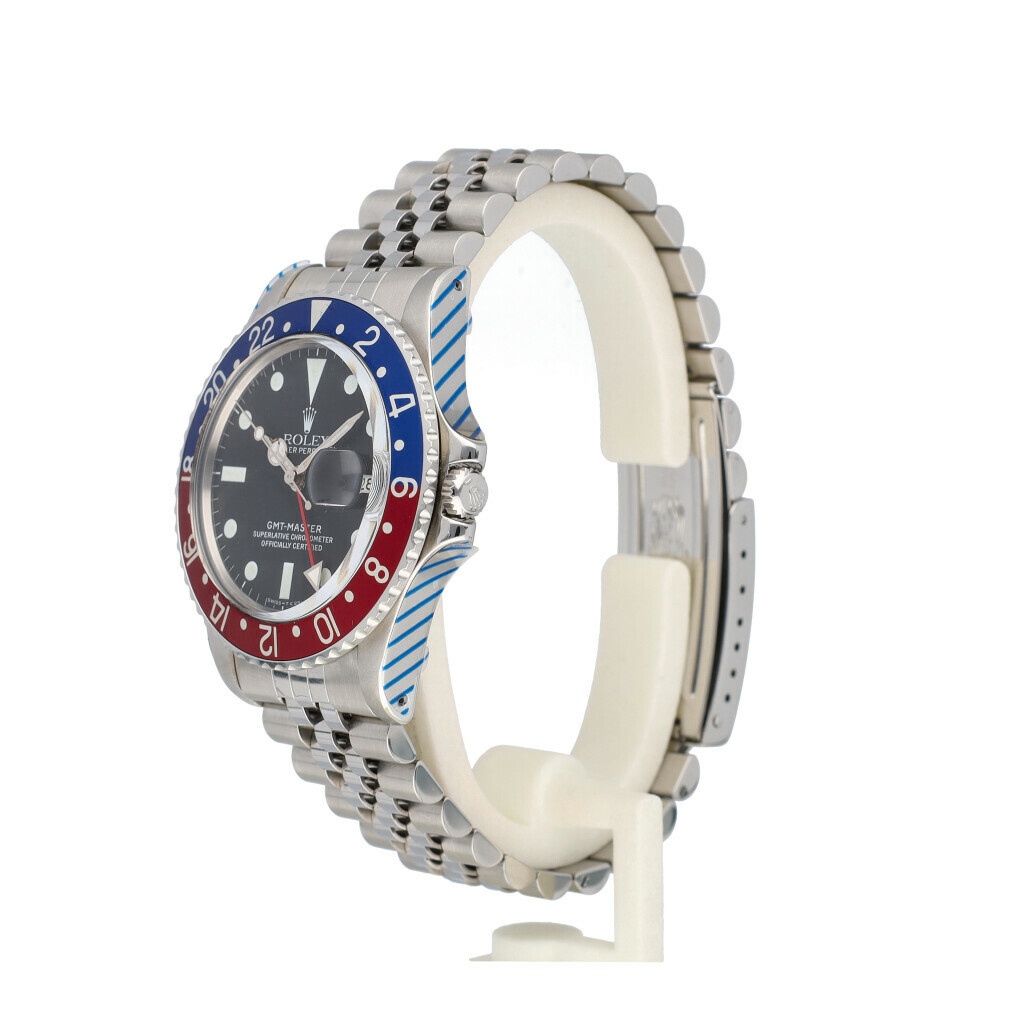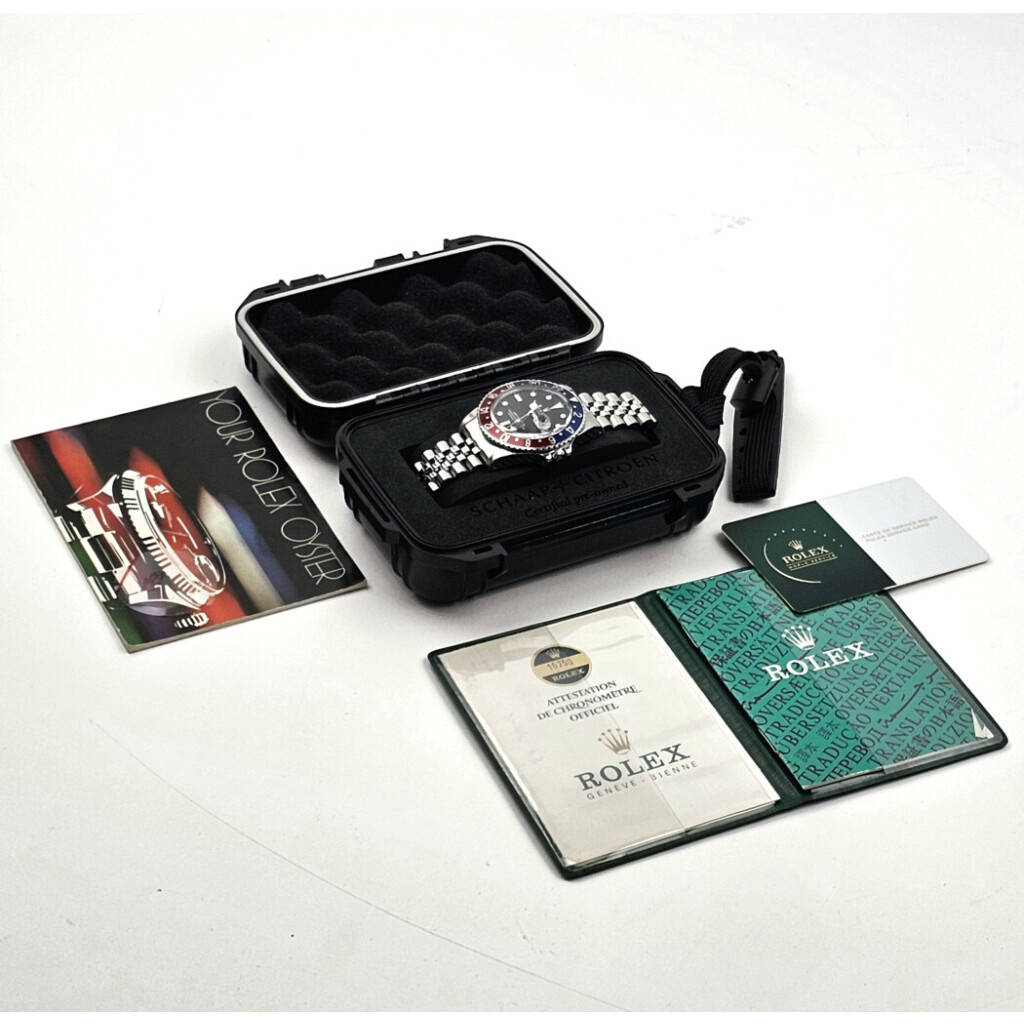 In very good condition Rolex GMT-Master in steel with so called blue and red "Pepsi" bezel and steel Jubilee bracelet from 1985 7505... serial) complete with papers, no box. Rolex serviced 10-2025 and not worn since. Rolex service certificate included.