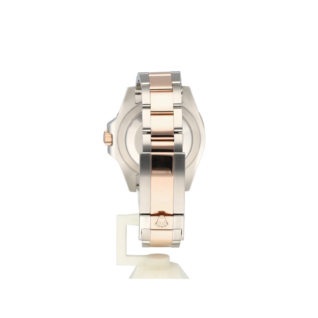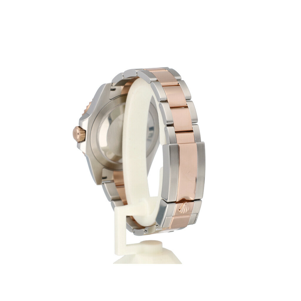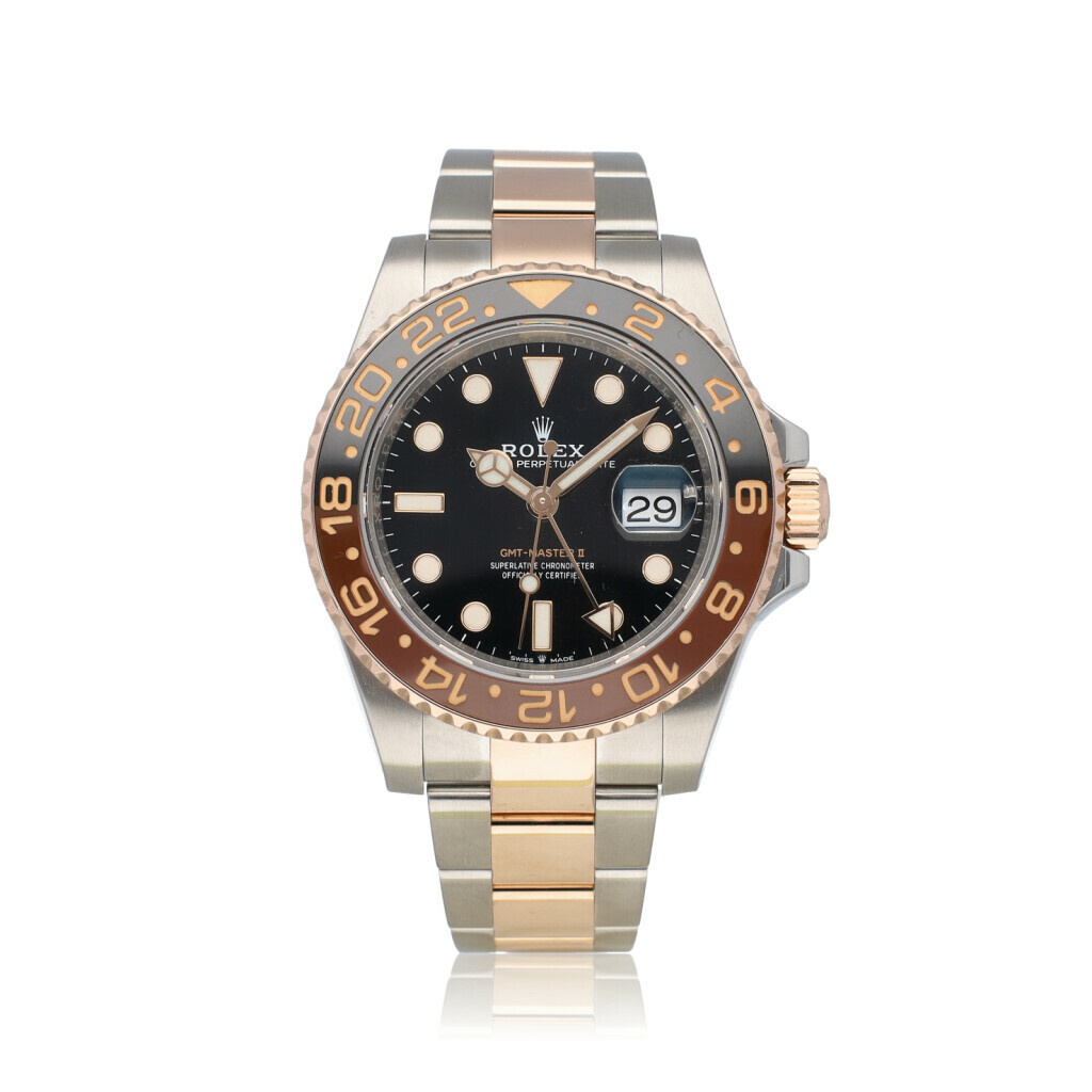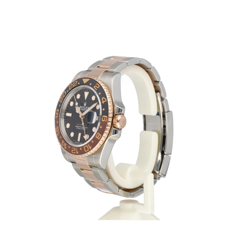In very good condition Rolex GMT-Master II so called "Rootbeer" in steel and rose gold with black and brown ceramic bezel and steel and rose gold Oyster bracelet from 2020 complete with box and papers. Purchaser and date of Purchase is visible, Name of Official Rolex Retailer has been damaged on certificate