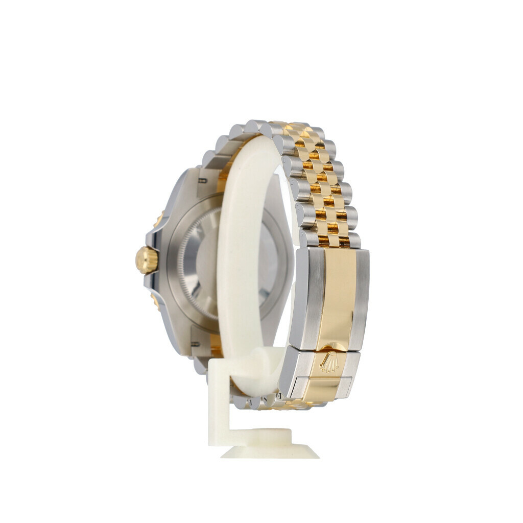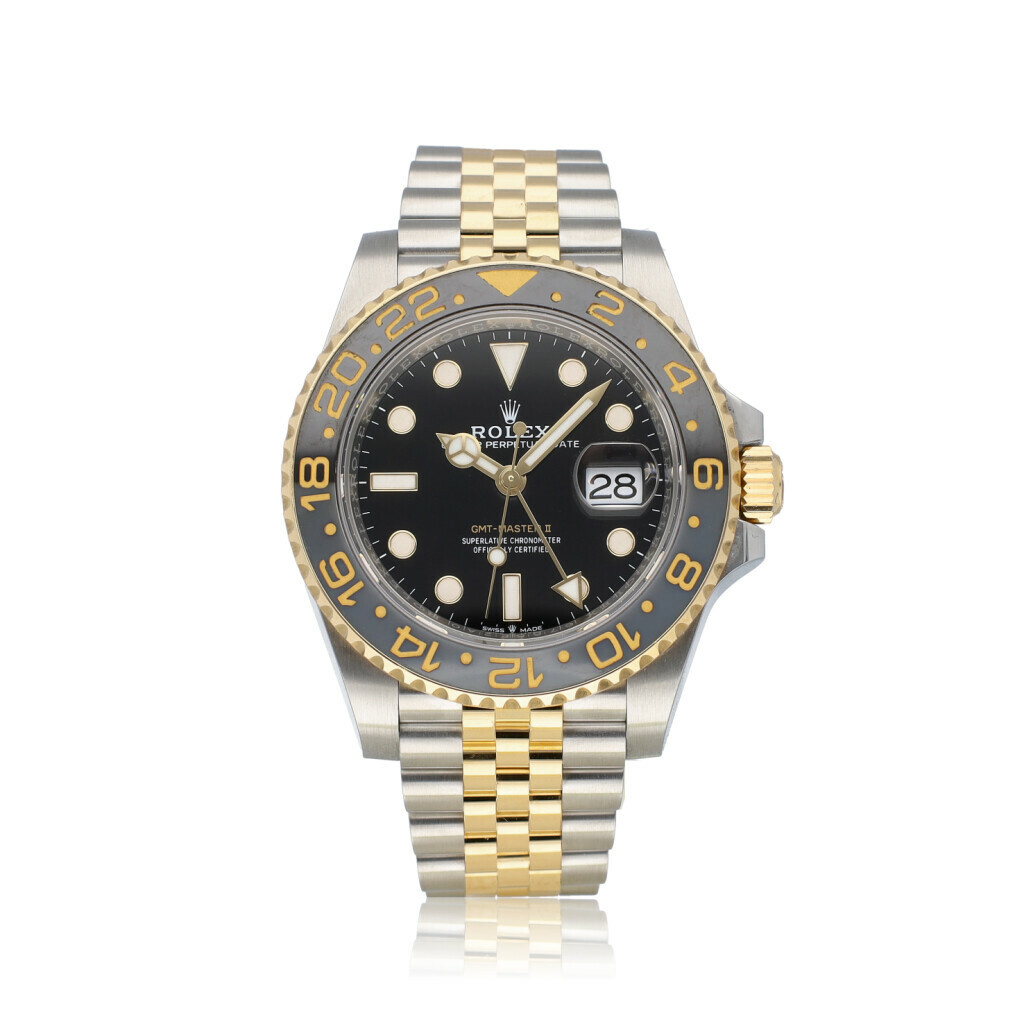 In very good condition Rolex GMT-Master II in steel and yellow gold with black dial, black and grey cermaic bezel and steel and yellow gold Jubilee bracelet from 2023 complete with box and papers.