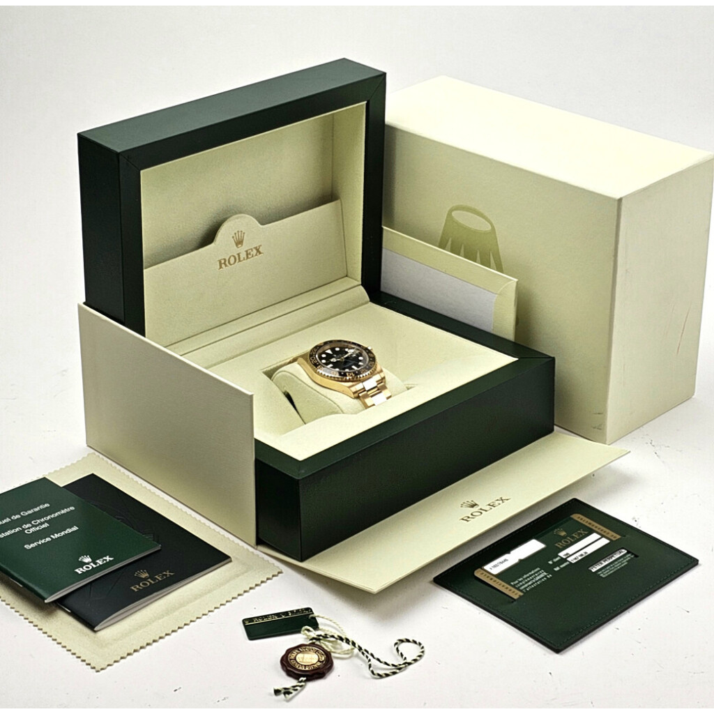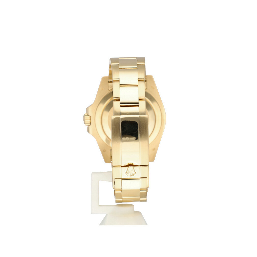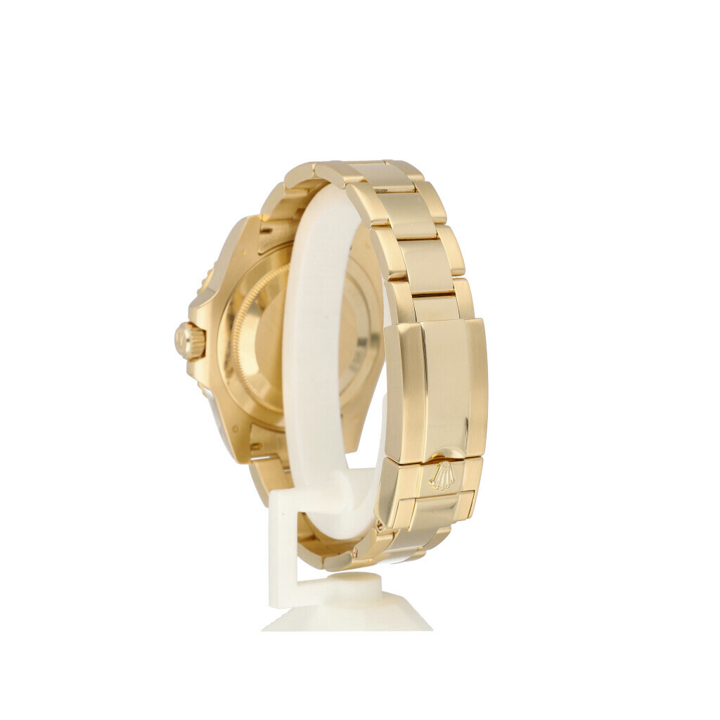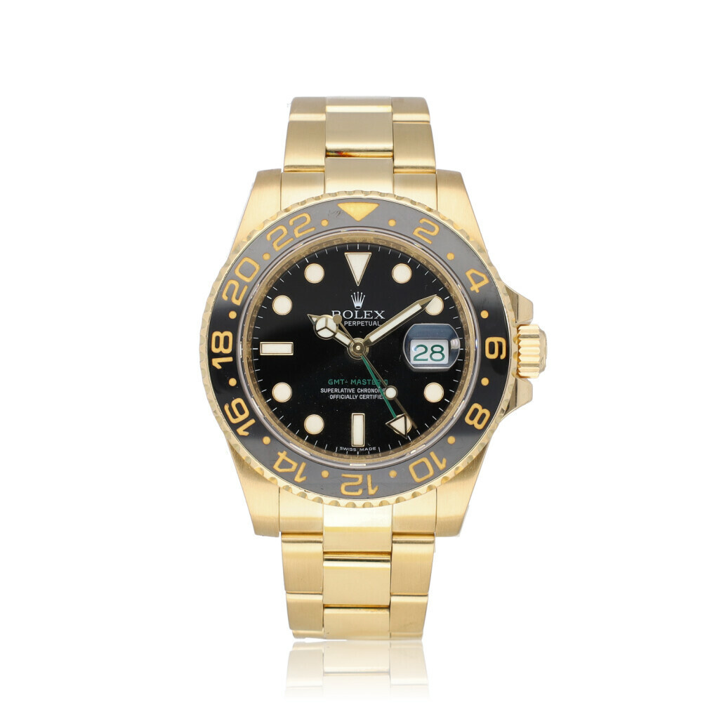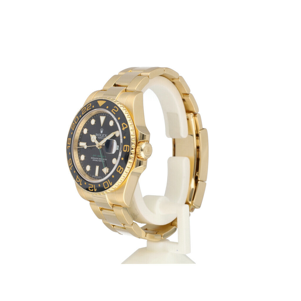 In very good condition Rolex GMT-Master II in yellow gold with black dial, black ceramic bezel and yellow gold Oyster bracelet from 2009 complete with box and papers.