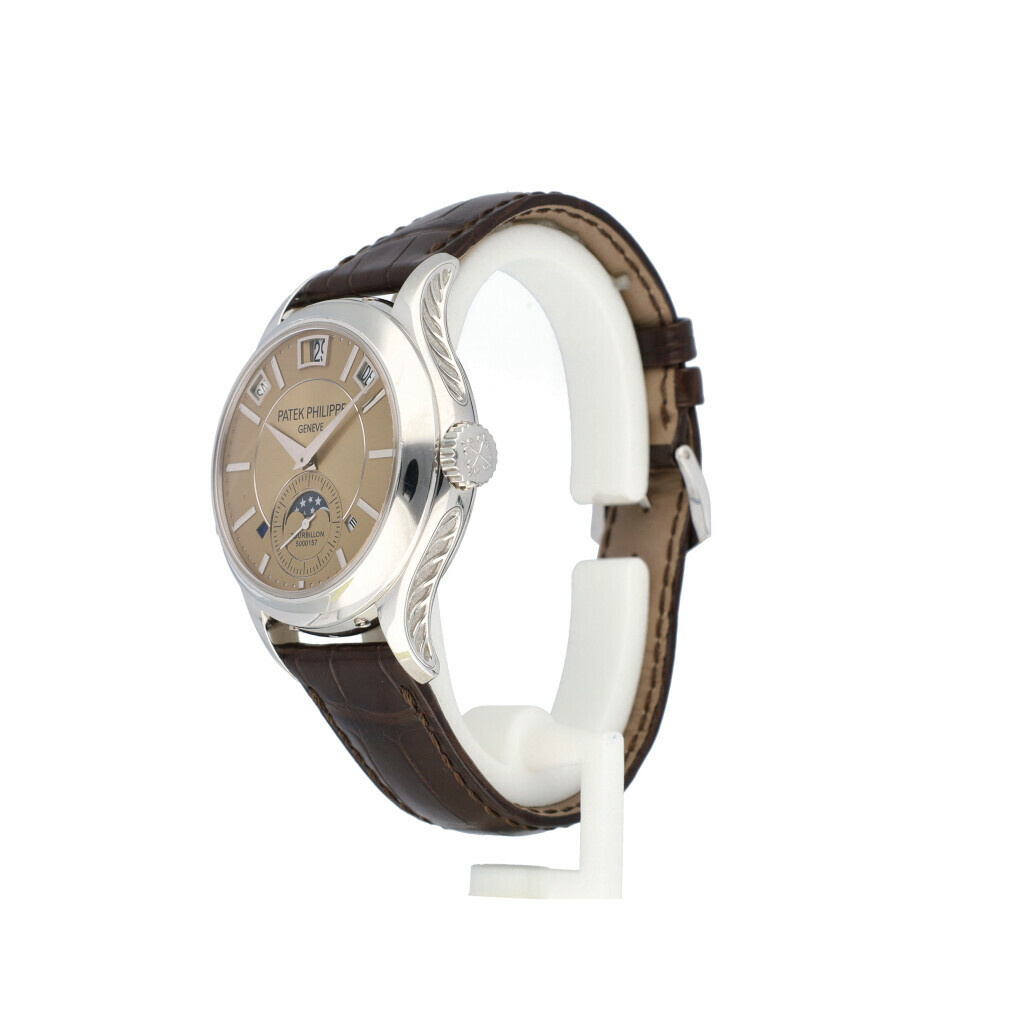 In very good condition, in closed Patek service seal Patek Philippe Grand Complications Minute Repeater Tourbillon Perpetual Calendar in platina with salmon colored dial. No box and/or papers. Patek serviced 7-2025 for € 15.000,- and not worn since. Still in closed Patek service seal, pictures made before sending over to Patek for service.