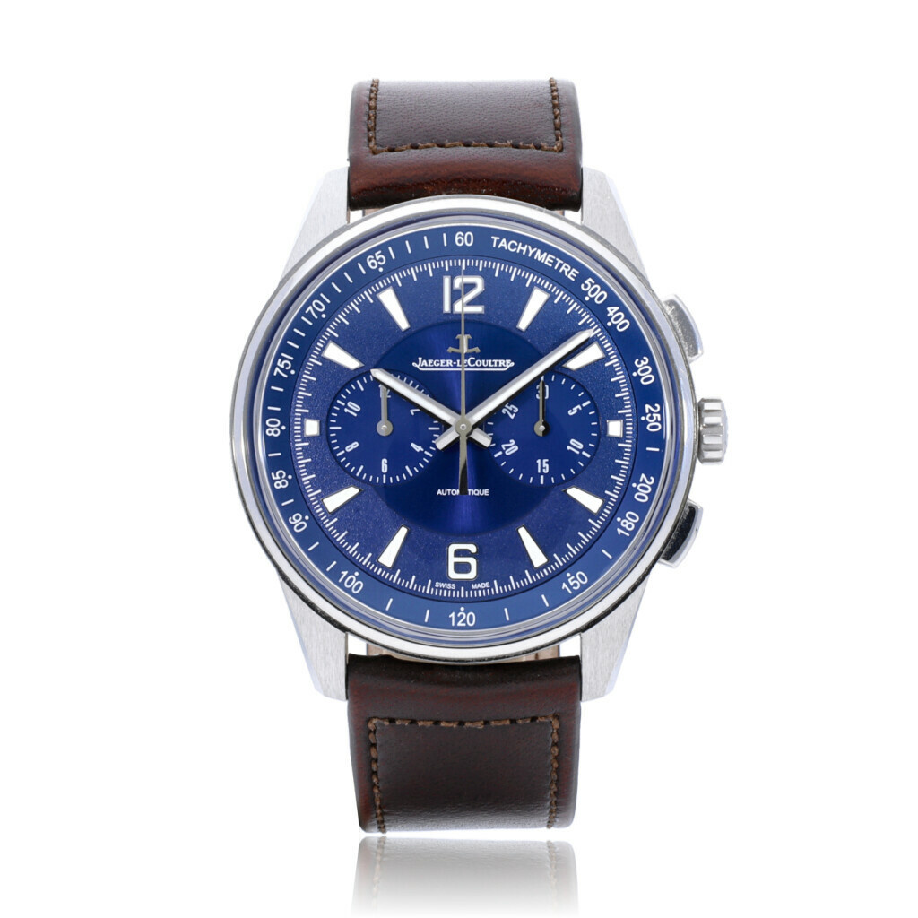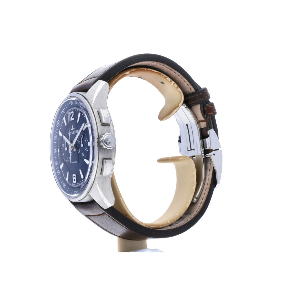 In fair condition, Jaeger-LeCoultre Polaris Chronograph in steel with blue dial. Complete with box and papers. 21% VAT deductible when shipped outside of the European Union.