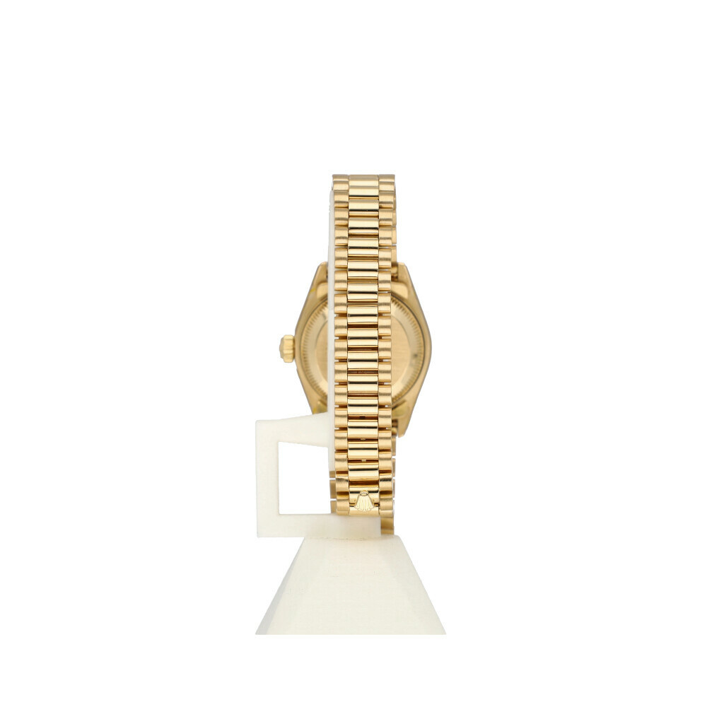 In very good condition Rolex Lady-Datejust in yellow gold with rare porcelain white roman factory diamond dial and bezel from +/- 1989 (L790... serial). No box and/or papers. Rolex serviced 10-2025 and not worn since. Rolex service certificate included.
