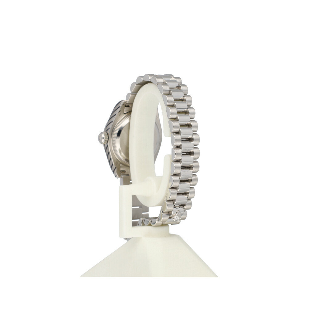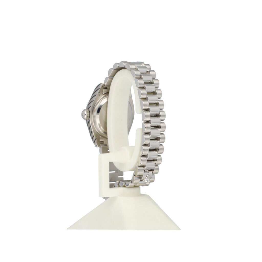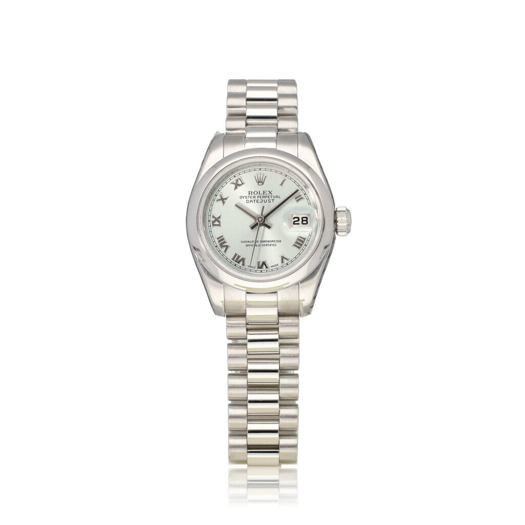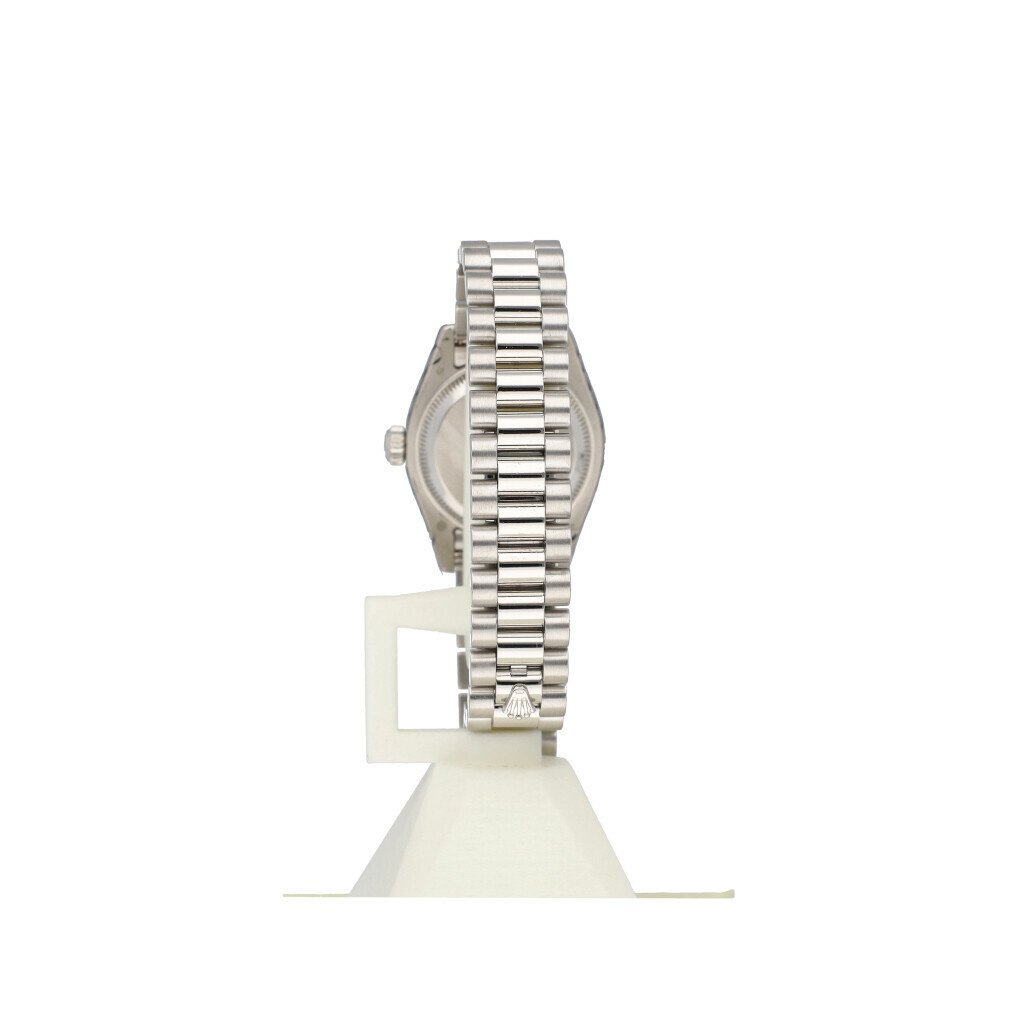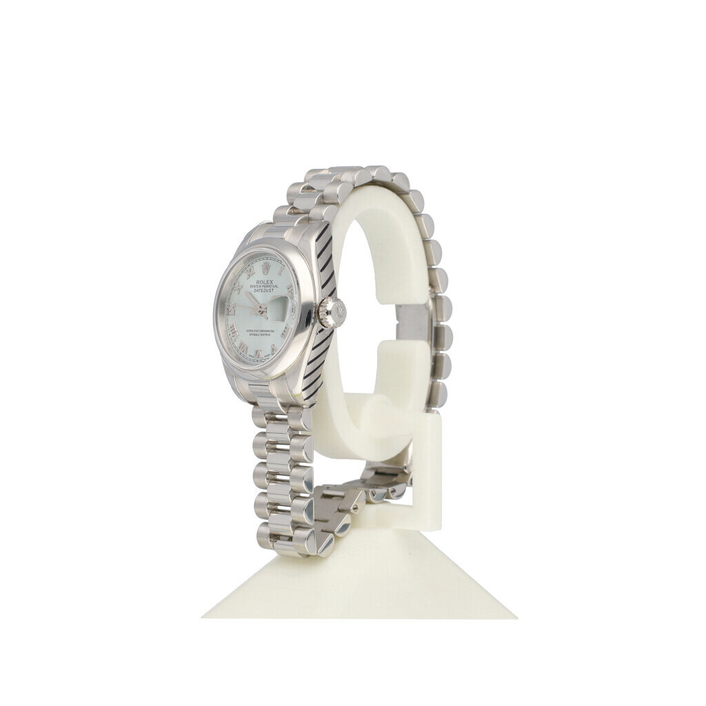 In very good condiiton Rolex Lady-Datejust in platinum with silver roman dial, domed bezel and platinum President bracelet from 2007 complete with box and papers. Rolex serviced 2-2026 and not worn since. Rolex service certificate included.