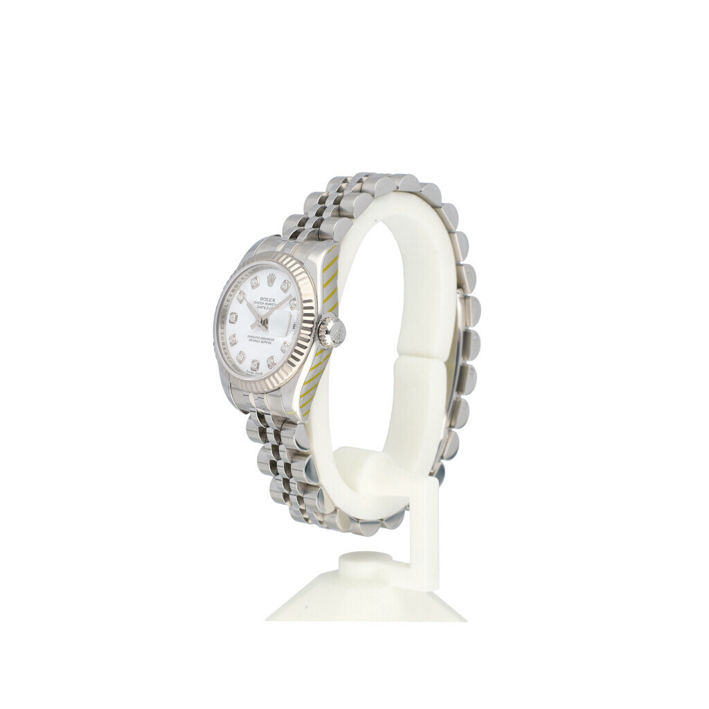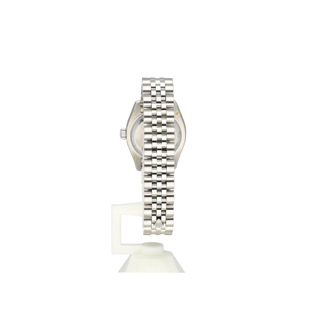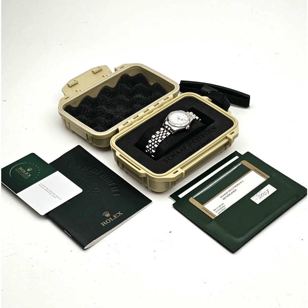 In very good condition Rolex Lady-Datejust 26 in steel with white factory diamond dial, white gold bezel and steel Jubilee bracelet from 2007 complete with papers, no box. Rolex serviced 7-2025 and not worn since. Rolex service certificate included.